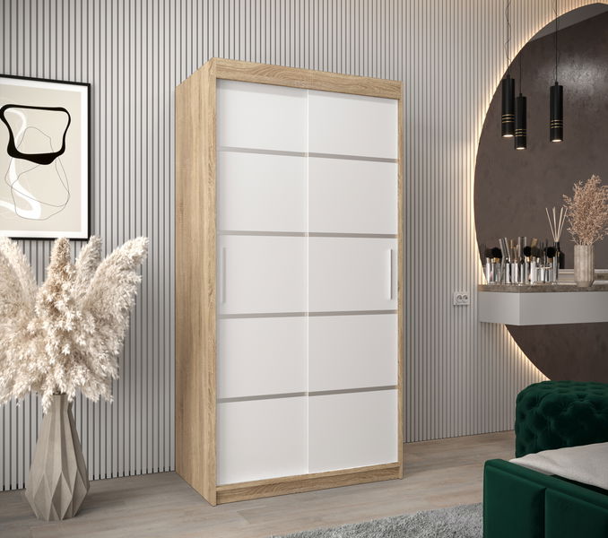 Šatní skříň Verika 1 100 (dub sonoma + bílá) je ideálním řešením pro uspořádání a ochranu vašich věcí. v kombinaci dub sonoma a bílá barva, která se dokonale hodí ke každému interiéru. Skříň je vyrobena z kvalitního materiálu a je velmi stabilní. Součástí skříně jsou také posuvné dveře, které ušetří prostor v místnosti.