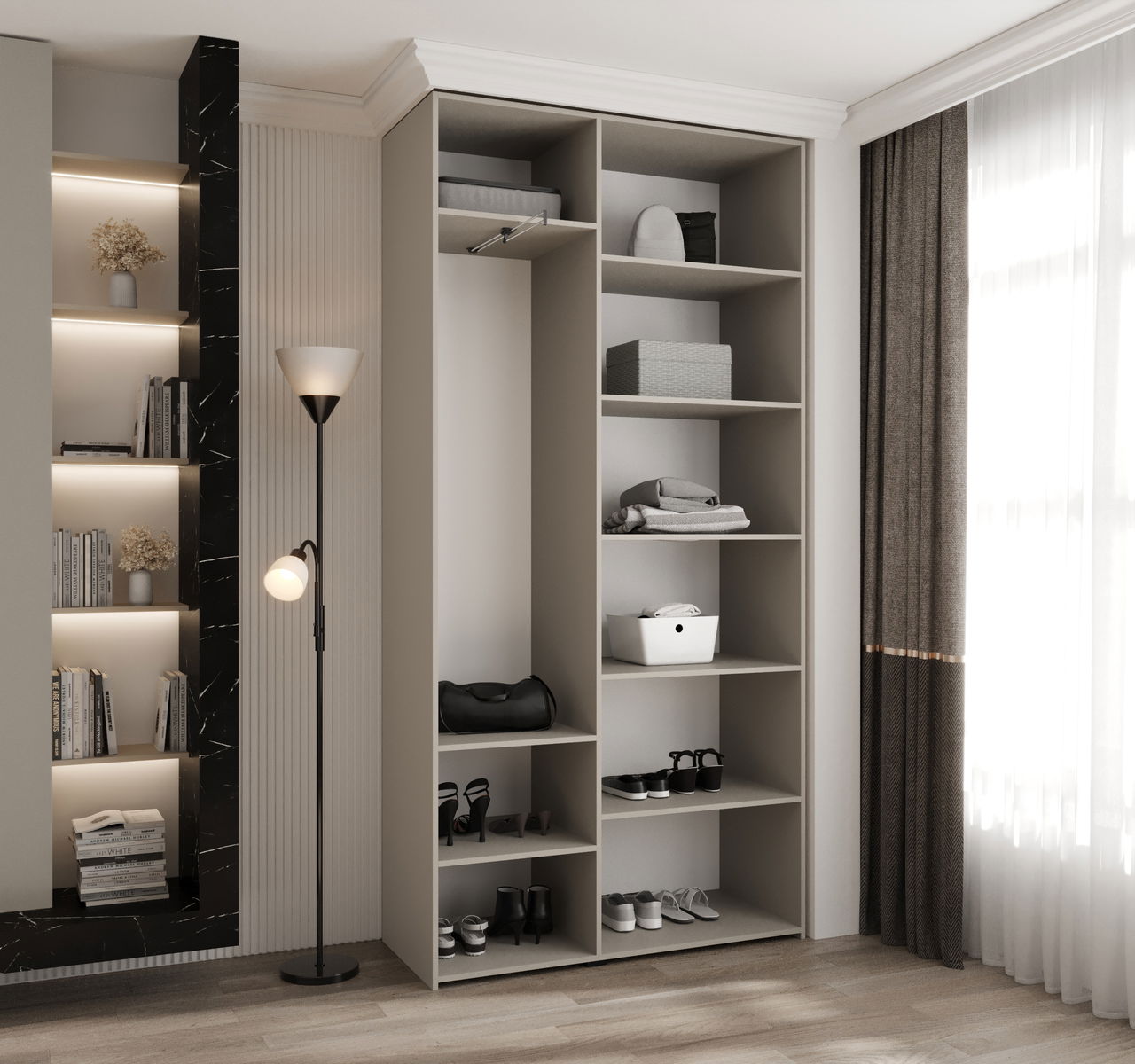 ZobrazitKolekce glamour šatní skříní Carmela kombinuje eleganci a funkčnost a promění vaši ložnici. Díky 11 šířkám od 100 do 200 cm a dvěma nadčasovým barvám si můžete šatník snadno přizpůsobit svým potřebám a velikosti místnosti.