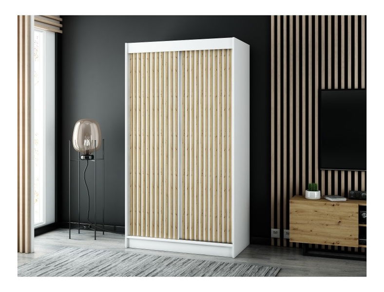 Tato šatní skříň je vyrobena z laminované desky o tloušťce 16 mm a pvc dýhou o tloušťce 0,5 cm. Na přední straně skříně jsou designové lamely o tloušťce 2 mm. Otevírání dveří je bezúchytkové. Vodidla jsou hliníková. Použitý je posuvný systém BIMAK.