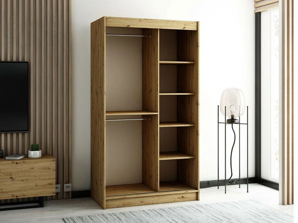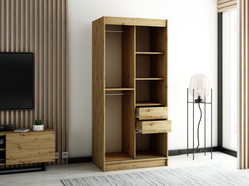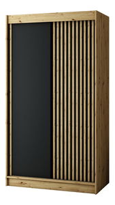 Ladonna šatní skříň je vyrobena z laminované desky o tloušťce 16 mm a PVC dýhy o tloušťce 0,5 cm. Jedny posuvné dveře jsou v matném provedení a na druhých jsou designové lamely (2 mm). Skříň se otevírá bezúchytkovým systémem. Vodidla jsou hliníková. Posuvný systém je značky BIMAK. Skříň se hodí do moderních a mladistvých prostor.