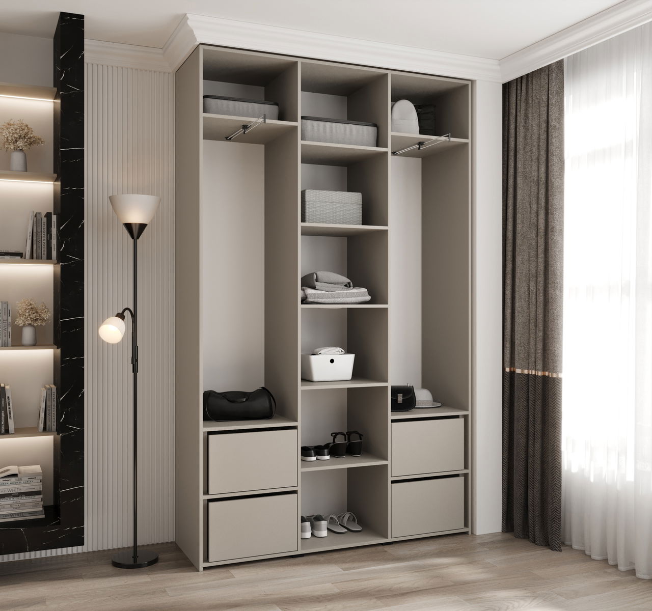 ZobrazitKolekce glamour šatní skříní Carmela kombinuje eleganci a funkčnost a promění vaši ložnici. Díky 11 šířkám od 100 do 200 cm a dvěma nadčasovým barvám si můžete šatník snadno přizpůsobit svým potřebám a velikosti místnosti.