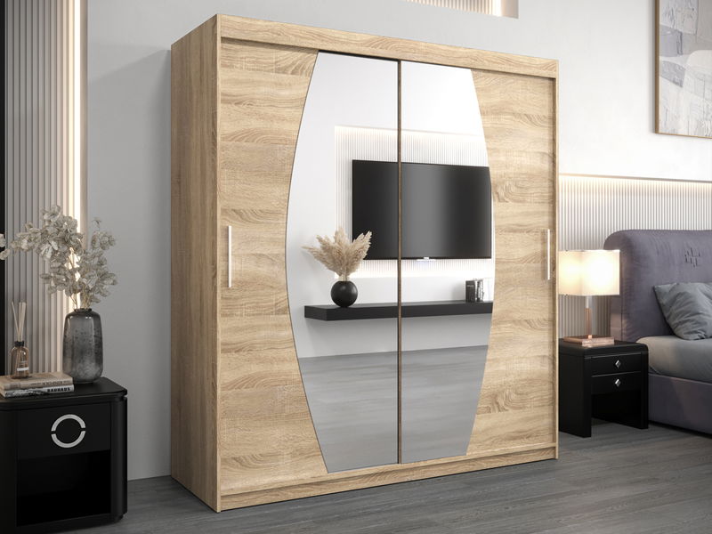 ZobrazitModerně navržená šatní skříň s posuvnými dveřmi Eclipse vám nabízí působivou šířku 180 cm. Je zkonstruována z vysoce kvalitní 16 mm laminované desky, která je doplněna ABS hranami o tloušťce 0,5 mm, zaručujícími vyšší odolnost. Na dveřích skříně naleznete praktické zrcadlo. Dveře se pohybují díky spolehlivému posuvnému systému LAGUNA na stabilních hliníkových vodítkách. Stříbrné podlouhlé úchyty z plastu elegantně zdůrazňují současný vzhled tohoto nábytku. Uvnitř skříně se nacházejí 2 věšákové tyče a 5 multifunkčních polic, které vám umožňují přehledné uskladnění oděvů a dalších potřeb.