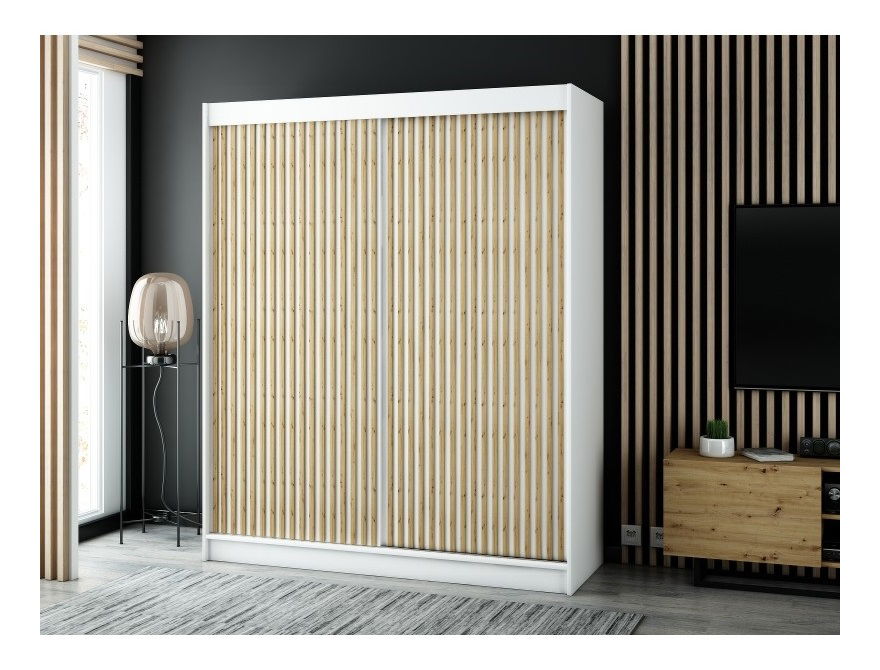 Tato šatní skříň je vyrobena z laminované desky o tloušťce 16 mm a pvc dýhou o tloušťce 0,5 cm. Na přední straně skříně jsou designové lamely o tloušťce 2 mm. Otevírání dveří je bezúchytkové. Vodidla jsou hliníková. Použitý je posuvný systém BIMAK.