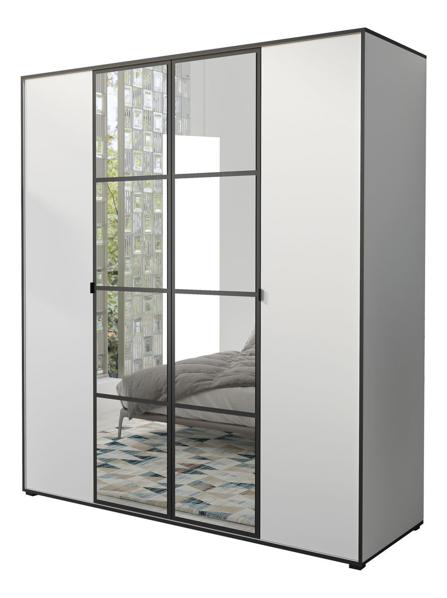 Zrcadlová šatní skříň o šířce 180 cm v nápaditém kontrastním provedení Oklahoma vám pomůže uložit vaše oblečení. Skříň má čtyři dvířka, z toho na dvou je nalepeno vícedílné zrcadlo. Uvnitř na pravé straně se nachází tyč na zavěšení košil či šatů a v levé části se nacházejí poličky na uložení poskládaných svetrů nebo triček. Dvířka skříně Oklahoma se otevírají malými madly. Skříň je vyrobena z dřevotřísky a je postavena na nízkých nožičkách.