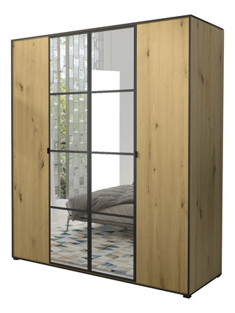 Zrcadlová šatní skříň o šířce 180 cm v nápaditém kontrastním provedení Oklahoma vám pomůže uložit vaše oblečení. Skříň má čtyři dvířka, z toho na dvou je nalepeno vícedílné zrcadlo. Uvnitř na pravé straně se nachází tyč na zavěšení košil či šatů a v levé části se nacházejí poličky na uložení poskládaných svetrů nebo triček. Dvířka skříně Oklahoma se otevírají malými madly. Skříň je vyrobena z dřevotřísky a je postavena na nízkých nožičkách.