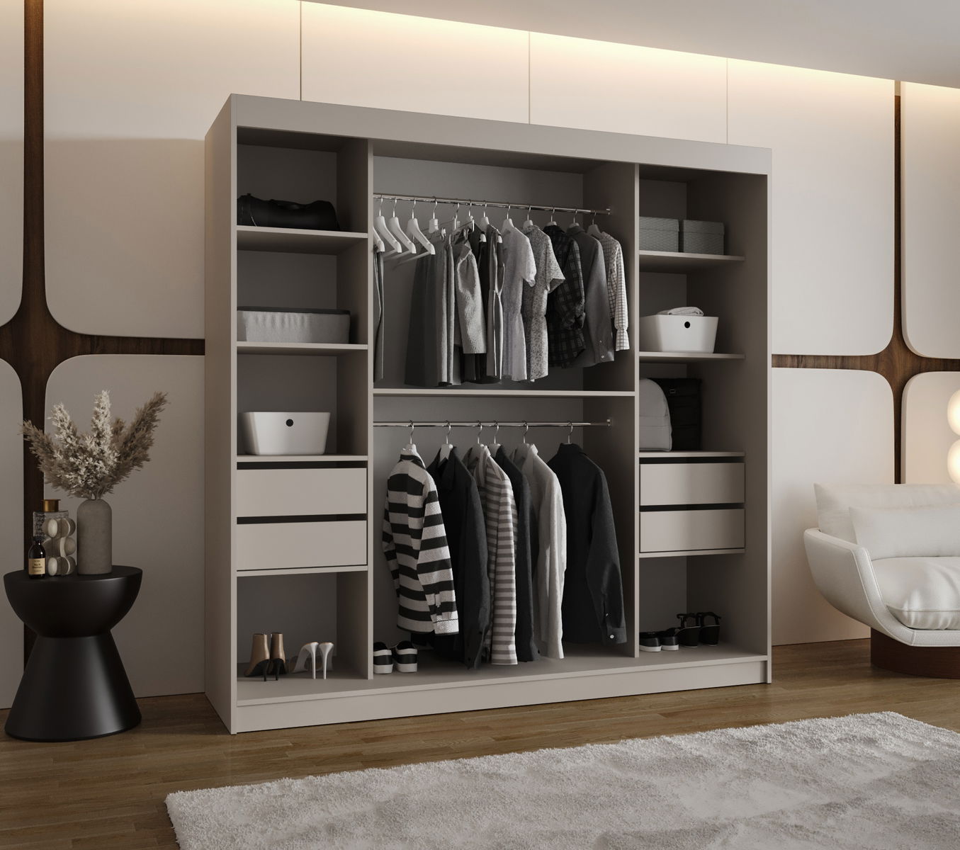 Šatní skříň Boomer má moderní, ale zároveň nadčasový design, který se vyznačuje jedinečně tvarovaným zrcadlem. Šatník je k dispozici ve dvou barvách a čtyřech různých velikostech. Skříň disponuje také LED osvětlením.