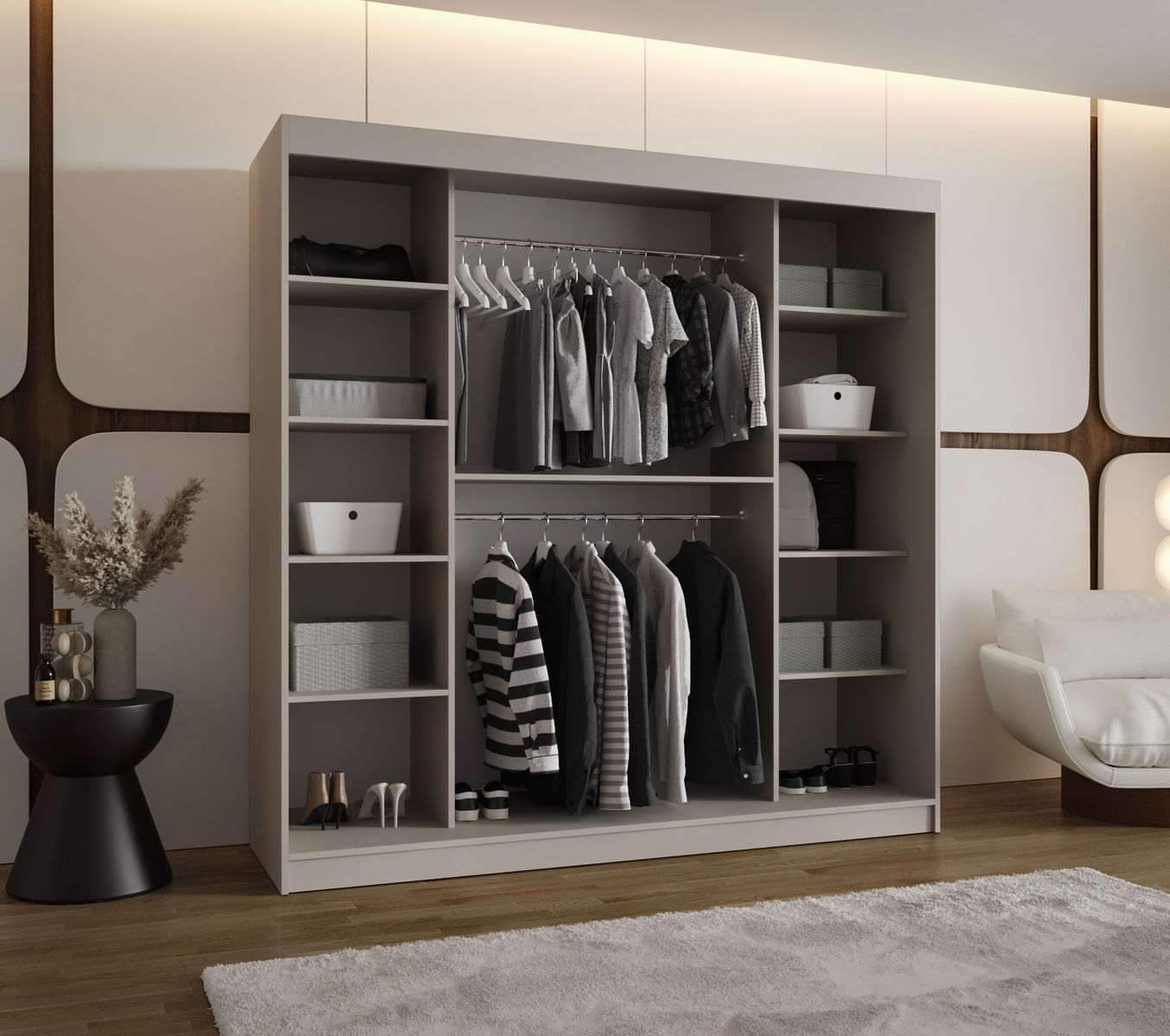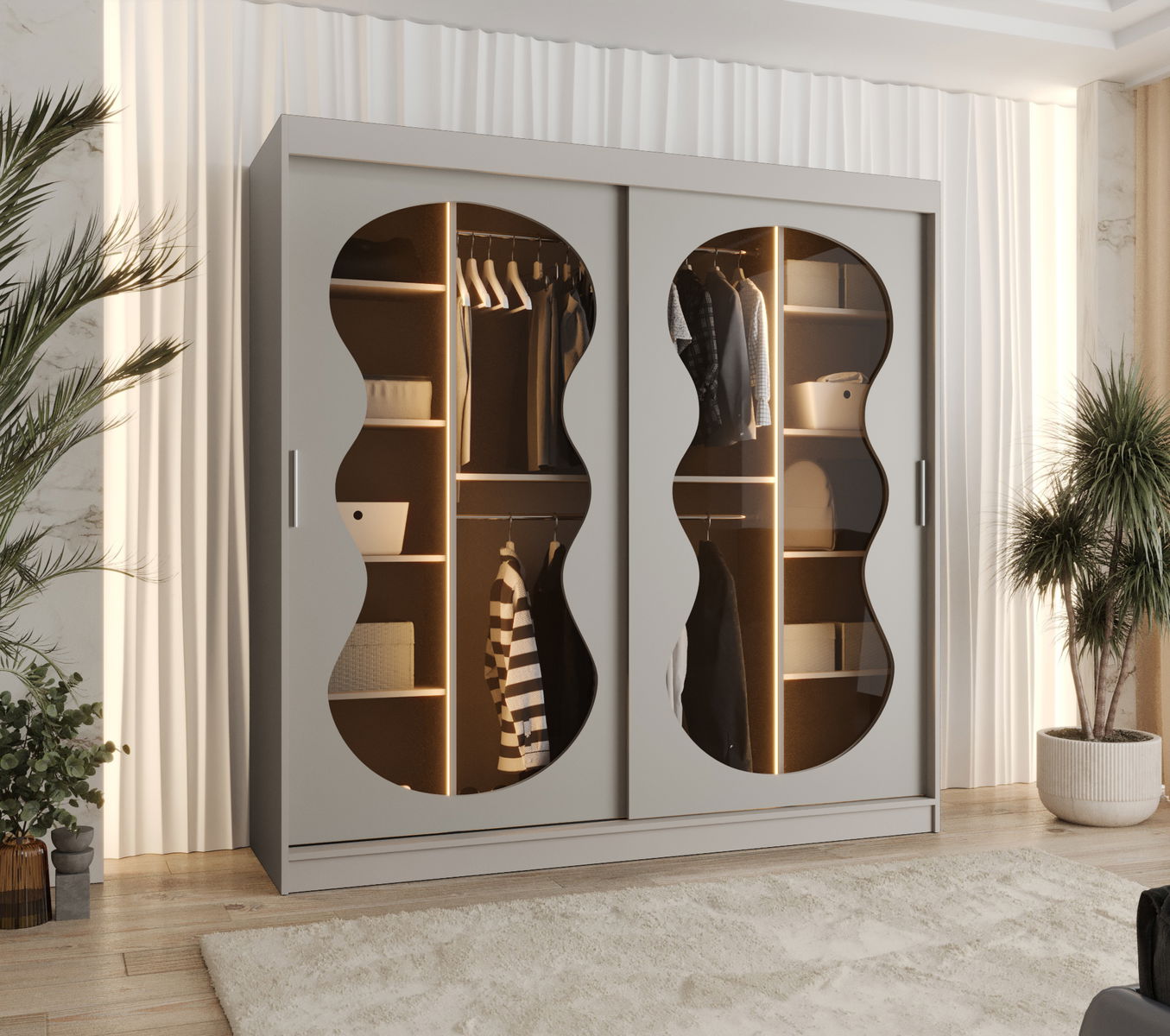Šatní skříň Boomer má moderní, ale zároveň nadčasový design, který se vyznačuje jedinečně tvarovaným zrcadlem. Šatník je k dispozici ve dvou barvách a čtyřech různých velikostech. Skříň disponuje také LED osvětlením.