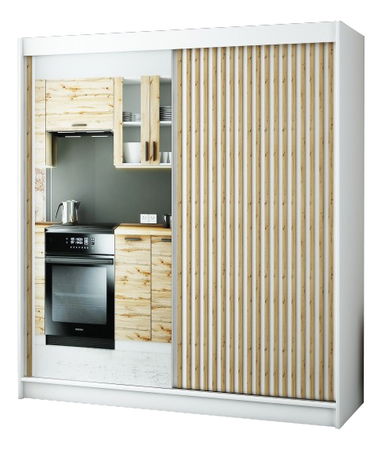 Šatní skříň Ladonna je vyrobena z laminované desky (16 mm) a PVC dýhy (0,5 cm). Přední strana je vyrobena z laminované desky (16 mm) s působivými lamelami (2 mm) a zrkadlem. Otevírání je bezúchytkové. Pohybová vodítka jsou hliníková. Posuvný systém je značky BIMAK. Rukojeť není k dispozici.