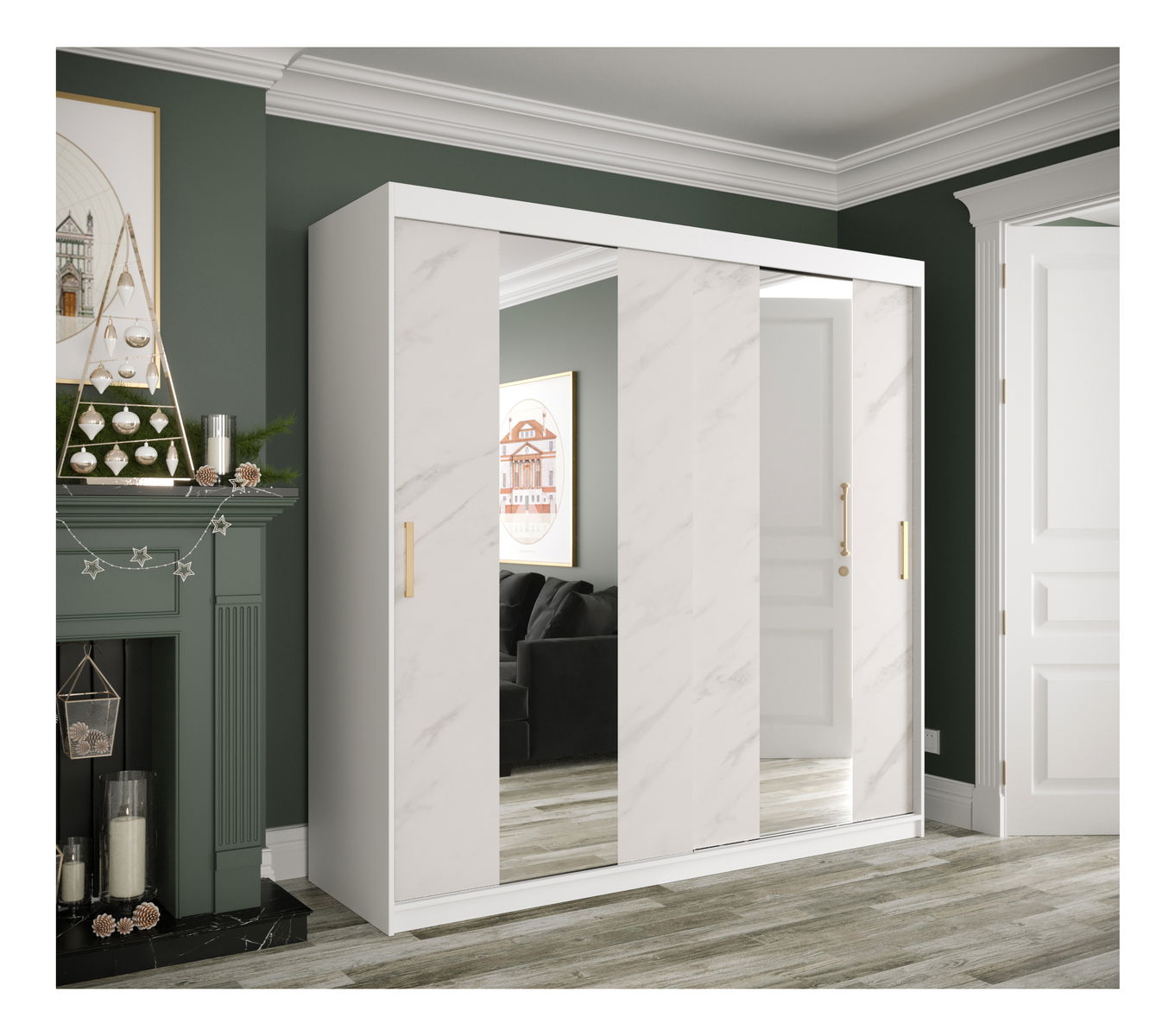 ZobrazitPředstavujeme vám šatní skříň Marbelo s posuvnými dveřmi: stylový a funkční doplněk vaší ložnice. Tato skříň s podmanivými akcenty připomínajícími mramor vyzařuje bohatství. Její zrcadlové posuvné dveře slouží nejen jako praktická pomůcka pro kontrolu vašeho oblečení, ale také osvětlují váš prostor. Zlaté úchytky dodávají šmrnc a zajišťují bezproblémový přístup do skříně. Uvnitř objevíte dostatek úložného prostoru pro oblečení, boty a doplňky, a to vše v odolném a elegantním provedení. Univerzální design skříně s posuvnými dveřmi Marbelo se bez problémů hodí do různých stylů místností, což z ní činí všestranný a poutavý kus nábytku. Pozvedněte estetiku a organizaci své ložnice díky skříni s posuvnými dveřmi Marbelo, která spojuje luxus s praktičností v kompaktním a úžasném balení.
