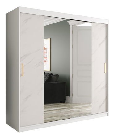 ZobrazitPředstavujeme vám šatní skříň Marbelo s posuvnými dveřmi: stylový a funkční doplněk vaší ložnice. Tato skříň s podmanivými akcenty připomínajícími mramor vyzařuje bohatství. Její zrcadlové posuvné dveře slouží nejen jako praktická pomůcka pro kontrolu vašeho oblečení, ale také osvětlují váš prostor. Zlaté úchytky dodávají šmrnc a zajišťují bezproblémový přístup do skříně. Uvnitř objevíte dostatek úložného prostoru pro oblečení, boty a doplňky, a to vše v odolném a elegantním provedení. Univerzální design skříně s posuvnými dveřmi Marbelo se bez problémů hodí do různých stylů místností, což z ní činí všestranný a poutavý kus nábytku. Pozvedněte estetiku a organizaci své ložnice díky skříni s posuvnými dveřmi Marbelo, která spojuje luxus s praktičností v kompaktním a úžasném balení.