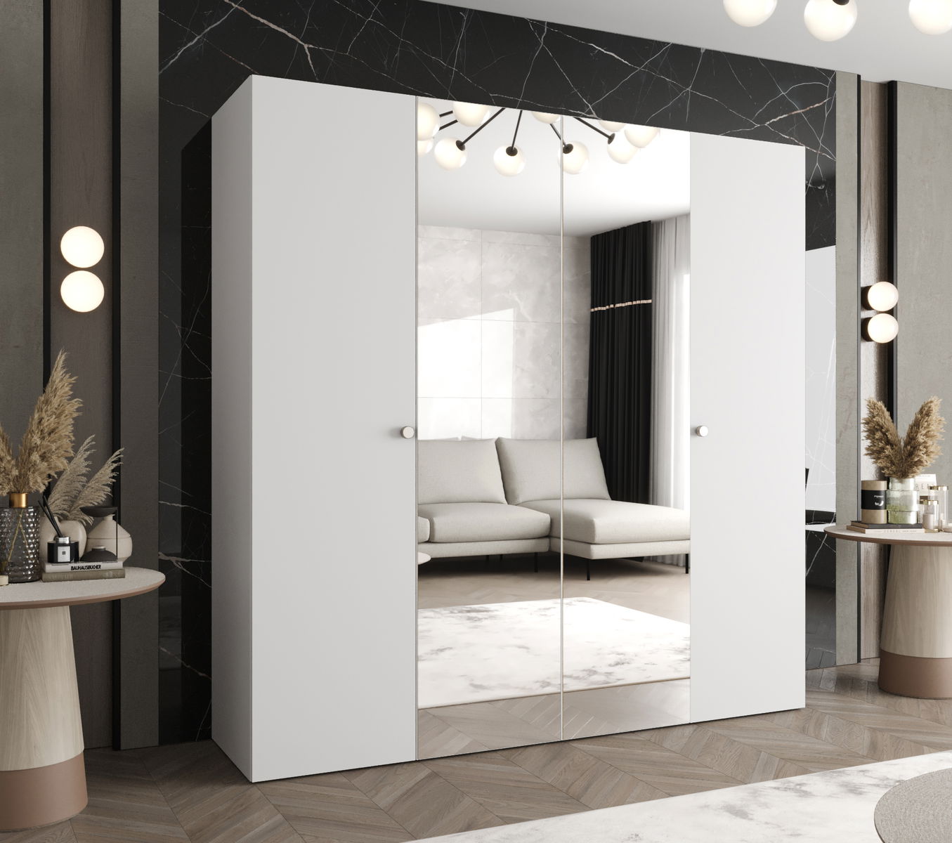 ZobrazitKolekce šatní skříní Parna se zrcadlem kombinuje eleganci a funkčnost a promění vaši ložnici. Díky pěti různým šířkám si můžete šatník snadno přizpůsobit svým potřebám a velikosti místnosti. Další výhodou je možnost dokoupení dalších polic, díky čemuž bude ještě funkčnější.