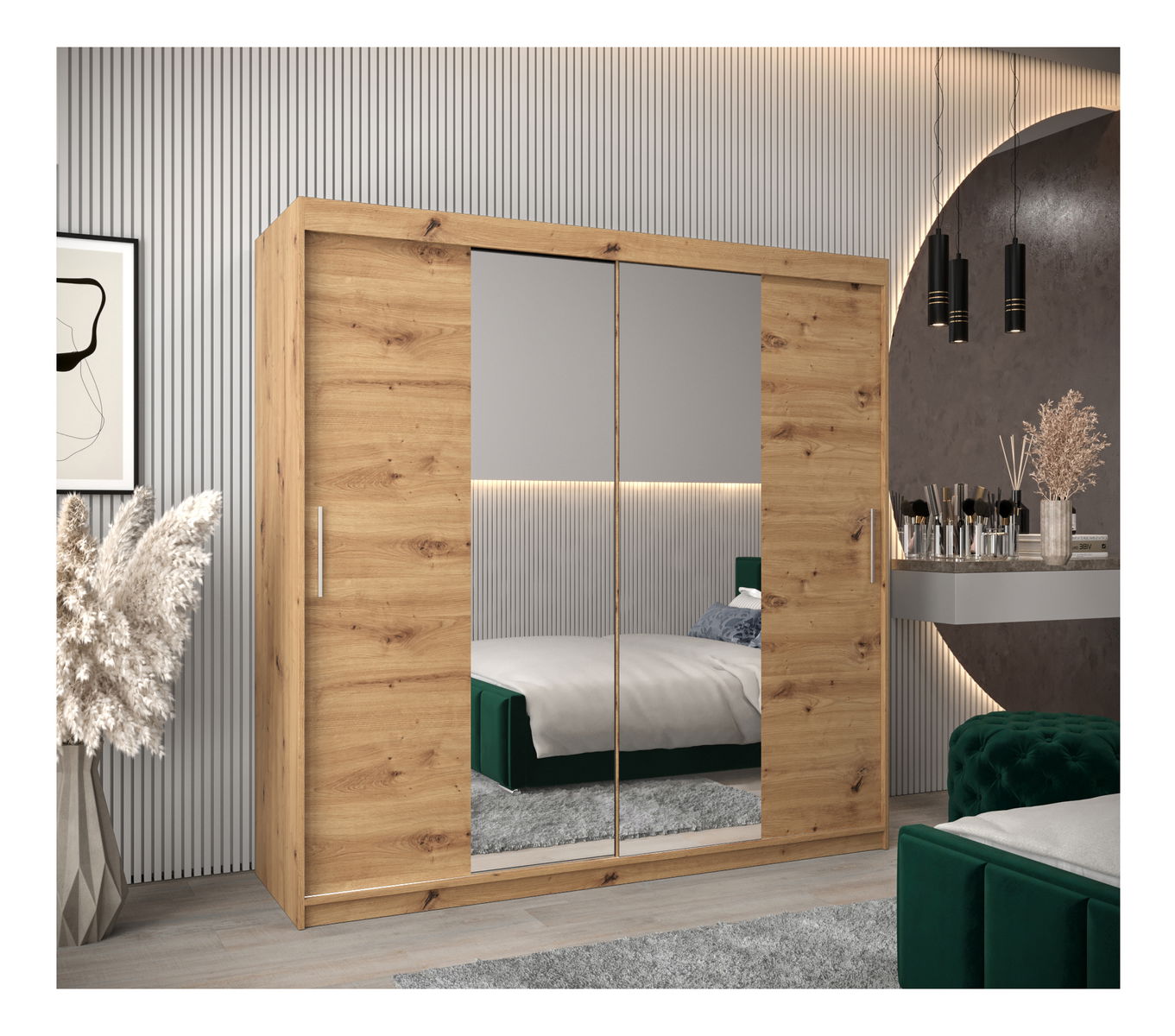 ZobrazitPředstavujeme šatní skříň Toki s posuvnými dveřmi - elegantní a moderní úložné řešení pro moderní domácnost. Šatní skříň Toki je vybavena inovativním posuvným systémem LAGUNA, který zajišťuje bezproblémový přístup do skříně a má stříbrné plastové úchytky pro minimalistický nádech. Díky zrcadlu, které zdobí posuvné dveře, nabízí pohodlí i styl. Tato šatní skříň je navržena tak, aby pozvedla váš prostor, a kombinuje praktičnost s minimalistickou estetikou. Snadno si v ní uspořádáte potřebné věci a dodáte svému pokoji nádech moderní elegance. Šatní skříň Toki s posuvnými dveřmi je ztělesněním formy a funkčnosti.