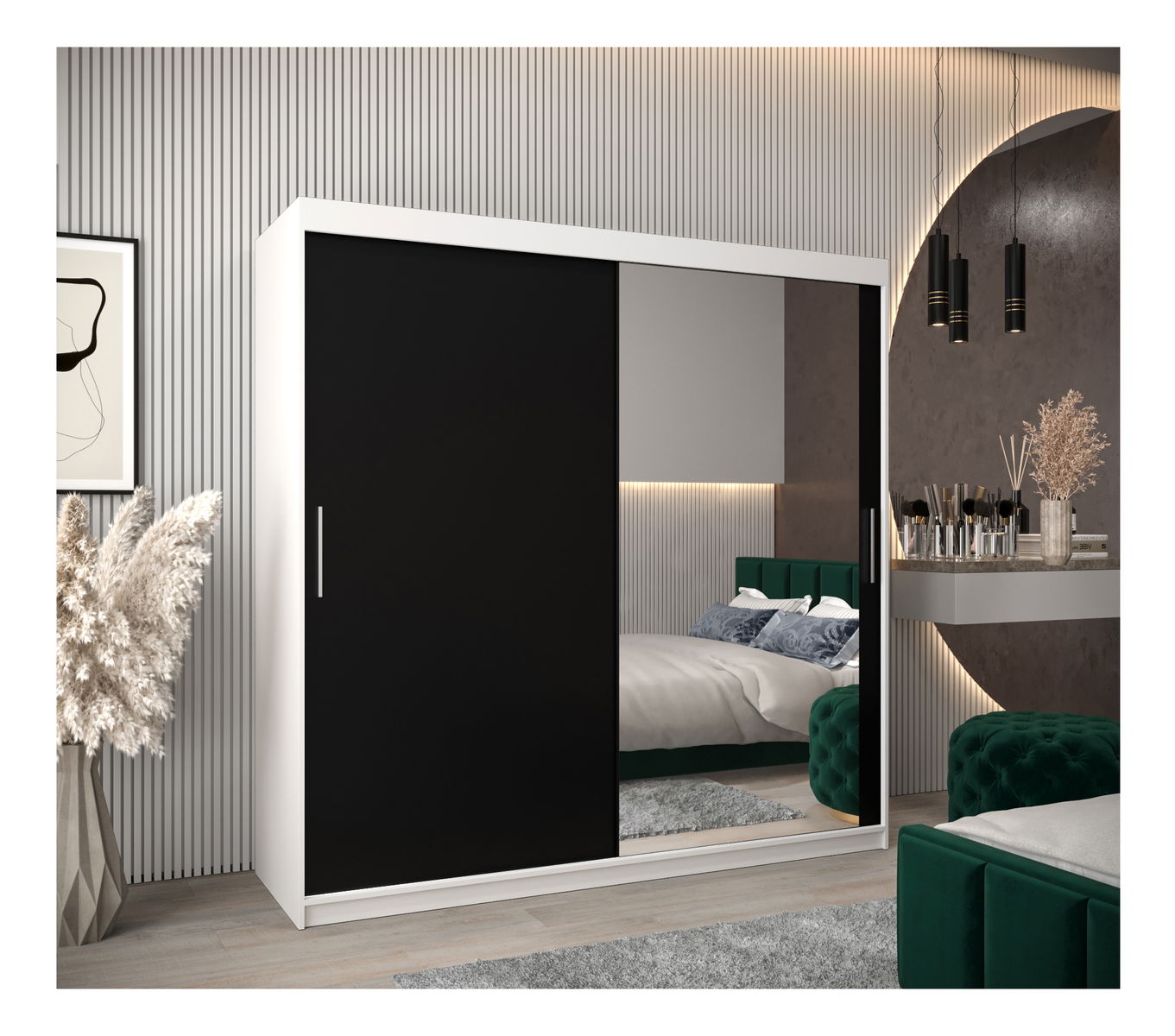 ZobrazitPředstavujeme šatní skříň Toki s posuvnými dveřmi - elegantní a moderní úložné řešení pro moderní domácnost. Šatní skříň Toki je vybavena inovativním posuvným systémem LAGUNA, který zajišťuje bezproblémový přístup do skříně a má stříbrné plastové úchytky pro minimalistický nádech. Díky zrcadlu, které zdobí posuvné dveře, nabízí pohodlí i styl. Tato šatní skříň je navržena tak, aby pozvedla váš prostor, a kombinuje praktičnost s minimalistickou estetikou. Snadno si v ní uspořádáte potřebné věci a dodáte svému pokoji nádech moderní elegance. Šatní skříň Toki s posuvnými dveřmi je ztělesněním formy a funkčnosti.