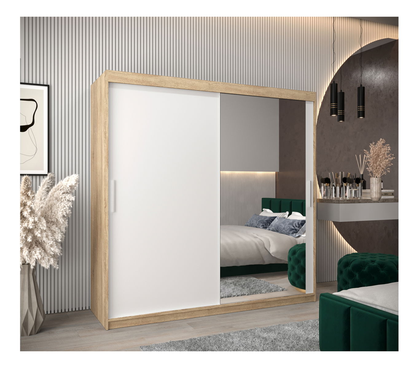 ZobrazitPředstavujeme šatní skříň Toki s posuvnými dveřmi - elegantní a moderní úložné řešení pro moderní domácnost. Šatní skříň Toki je vybavena inovativním posuvným systémem LAGUNA, který zajišťuje bezproblémový přístup do skříně a má stříbrné plastové úchytky pro minimalistický nádech. Díky zrcadlu, které zdobí posuvné dveře, nabízí pohodlí i styl. Tato šatní skříň je navržena tak, aby pozvedla váš prostor, a kombinuje praktičnost s minimalistickou estetikou. Snadno si v ní uspořádáte potřebné věci a dodáte svému pokoji nádech moderní elegance. Šatní skříň Toki s posuvnými dveřmi je ztělesněním formy a funkčnosti.