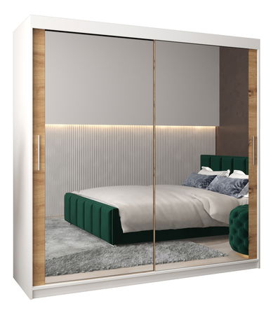 Představujeme šatní skříň Toki s posuvnými dveřmi - elegantní a moderní úložné řešení pro moderní domácnost. Šatní skříň Toki je vybavena inovativním posuvným systémem LAGUNA, který zajišťuje bezproblémový přístup do skříně a má stříbrné plastové úchytky pro minimalistický nádech. Díky zrcadlu, které zdobí posuvné dveře, nabízí pohodlí i styl. Tato šatní skříň je navržena tak, aby pozvedla váš prostor, a kombinuje praktičnost s minimalistickou estetikou. Snadno si v ní uspořádáte potřebné věci a dodáte svému pokoji nádech moderní elegance. Šatní skříň Toki s posuvnými dveřmi je ztělesněním formy a funkčnosti.