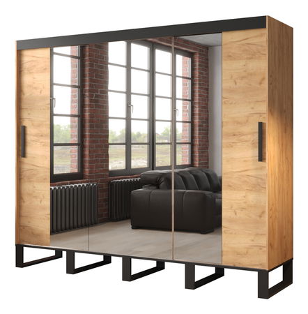 Šatní skříň Lennox o šířce 250 cm reprezentuje šarm industriálního stylu, který vašemu domovu dodá moderní a zajímavý vzhled. Skříň je vyrobena z kvalitní 16 mm laminované desky, okraje jsou opatřeny ABS hranami o tloušťce 0,5 mm, což zajišťuje dlouhou životnost skříně. Skříň stojí na černých kovových nožičkách o rozměrech 2 x 8 cm a výšce 10 cm, což podtrhuje její stabilní konstrukci. Skříň má troje posuvné dveře s černými podlouhlými dřevěnými úchyty, přičemž jsou vybaveny zrcadlem, které opticky zvětší prostor. Hliníková vodítka a posuvný systém BIMAK zajišťují plynulé a tiché otevírání a zavírání dveří. Uvnitř skříně se nacházejí dvě věšákové tyče a devět polic poskytující bohatý úložný prostor pro všechny vaše oděvy a osobní předměty.