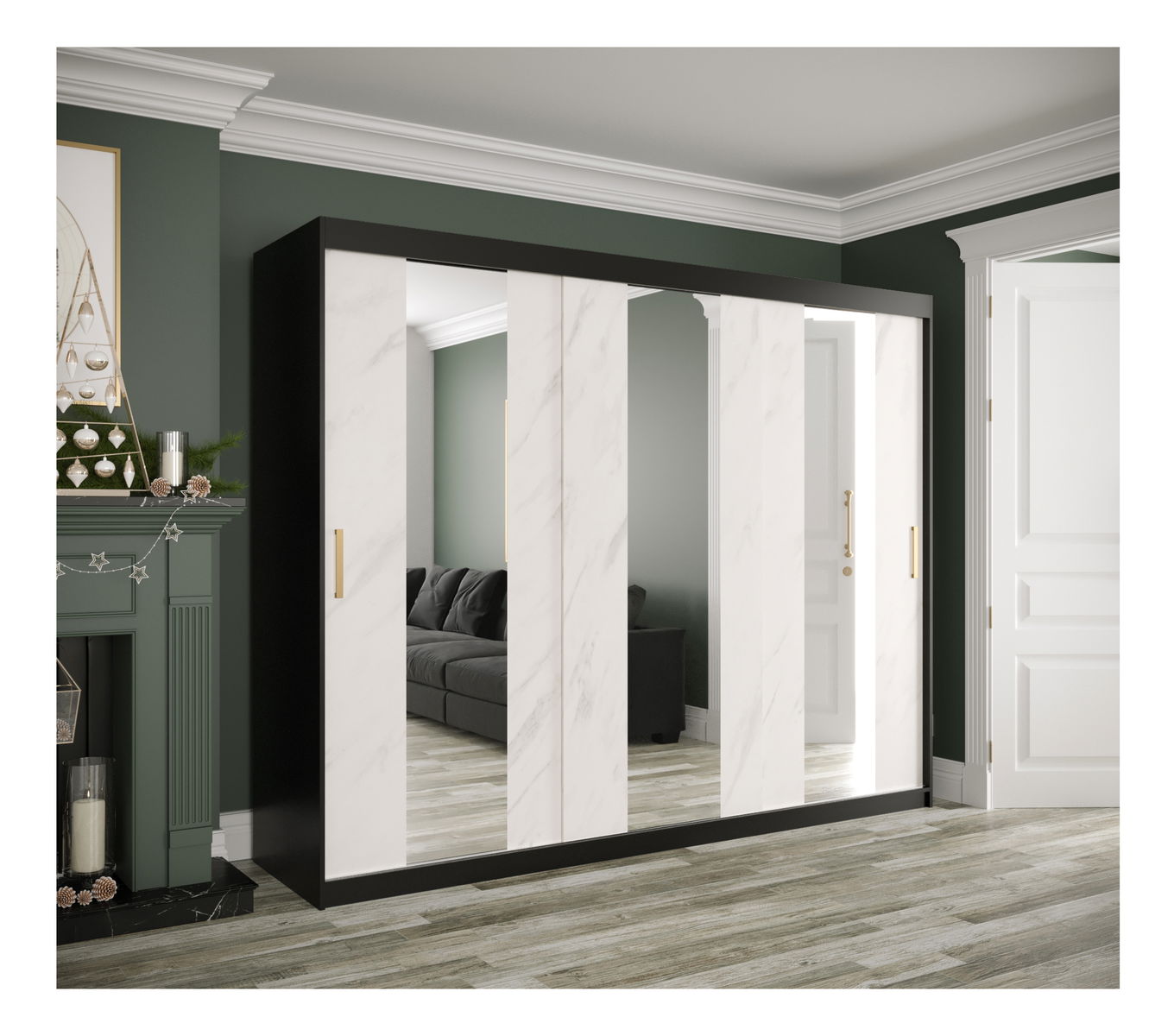 Šatní skříň 250 cm Marbelo P (matná černá + bílý mramor)
