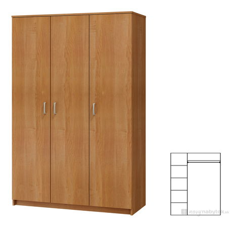Moderní třídílná (třídveřová) šatní skříň s dostatkem úložného prostoru. Uvnitř se na pravé straně (za dvěma dveřmi) nachází pod poličkou věšáková tyč. Levá strana je vybavena 4 poličkami. Provedení olše.