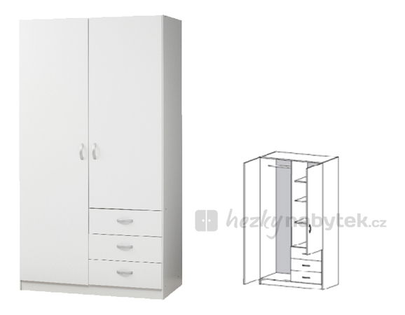 Dvoudílná šatní skříň má jednoduchý, moderní a čistý design. Hodí se do předsíní a ložnic. Poskytne vám dostatek úložného prostoru pro vaše oblečení a doplňky. V levé části skříně se nachází věšáková tyč a v pravé části se nacházejí poličky a tři zásuvky. Je v elegantním bílém provedení.