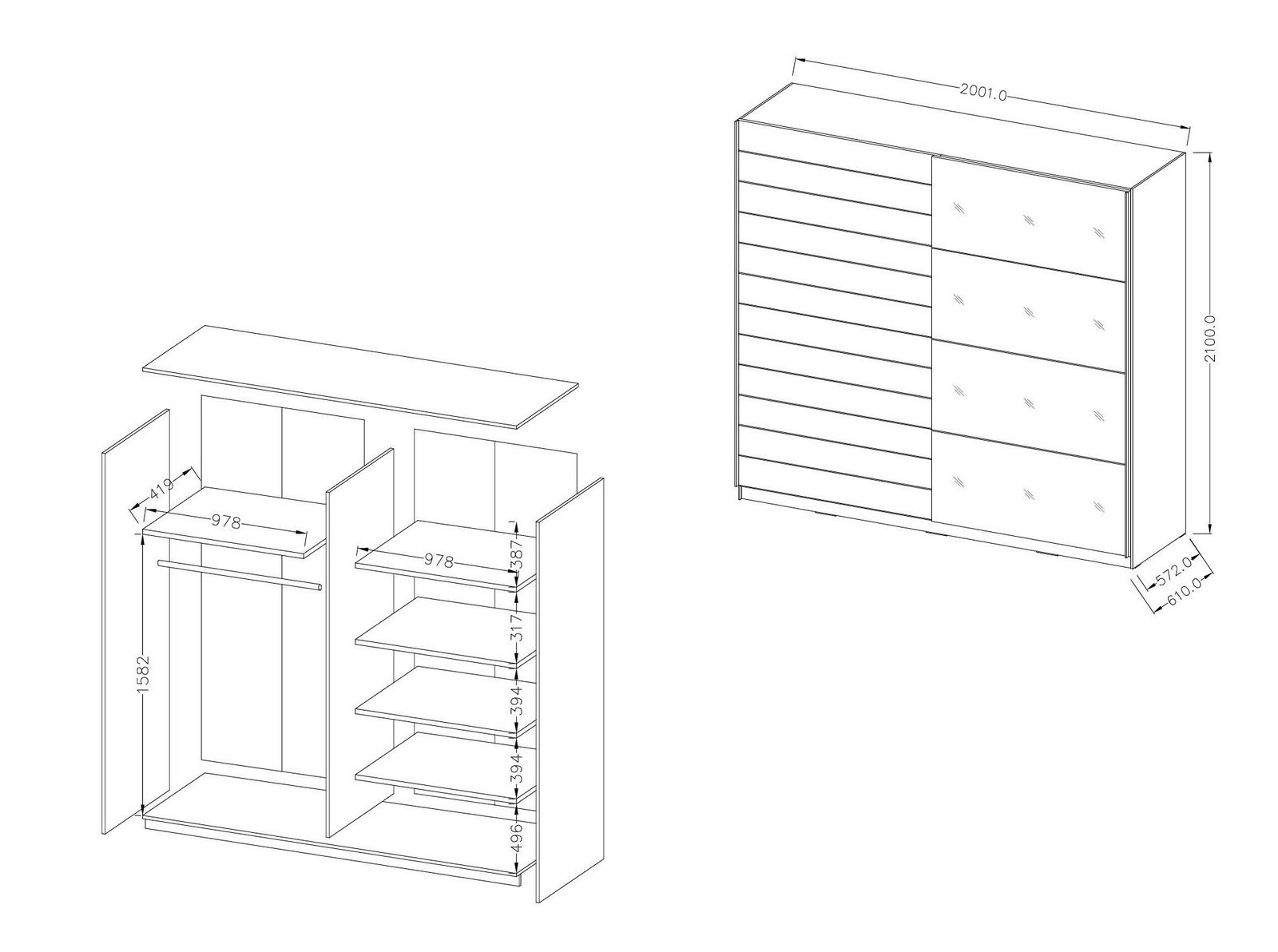 Priestranná moderná šatníková skriňa zo série Afrodita prekvapí svojím veľkým úložným priestorom. Doprajte svojmu oblečenie voľnosť a poriadok. V pravej časti sú prakticky umiestnené police a v ľavej vešiaková tyč, nad ktorou sa taktiež nachádza jedna polica. Oceníte posuvné dvere namontované na pevných vodiacich lištách, čím šetria v miestnosti priestor. Vhodná je do spálne i chodby.