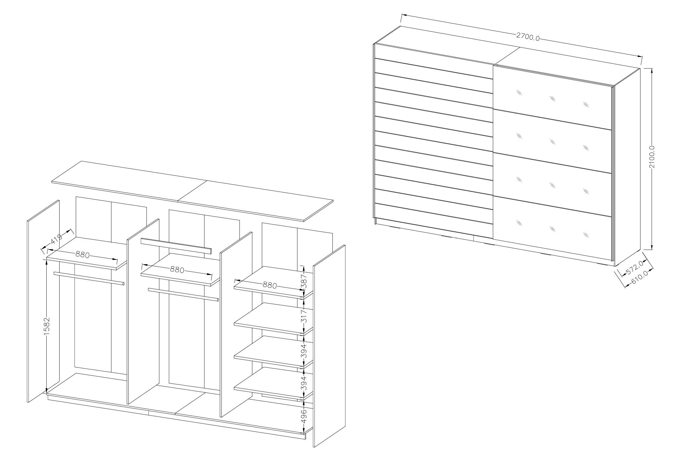 Prostorná moderní šatní skříň ze série Afrodita překvapí svým velkým úložným prostorem. Dopřejte svému oblečení volnost a pořádek. V pravé části jsou prakticky umístěny police a ve střední a levé části najdete dvě věšákové tyče, nad nimiž se také nacházejí police. Oceníte posuvné dveře namontované na pevných vodicích lištách, čímž šetří v místnosti prostor. Vhodná je do ložnice i chodby.