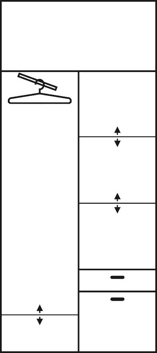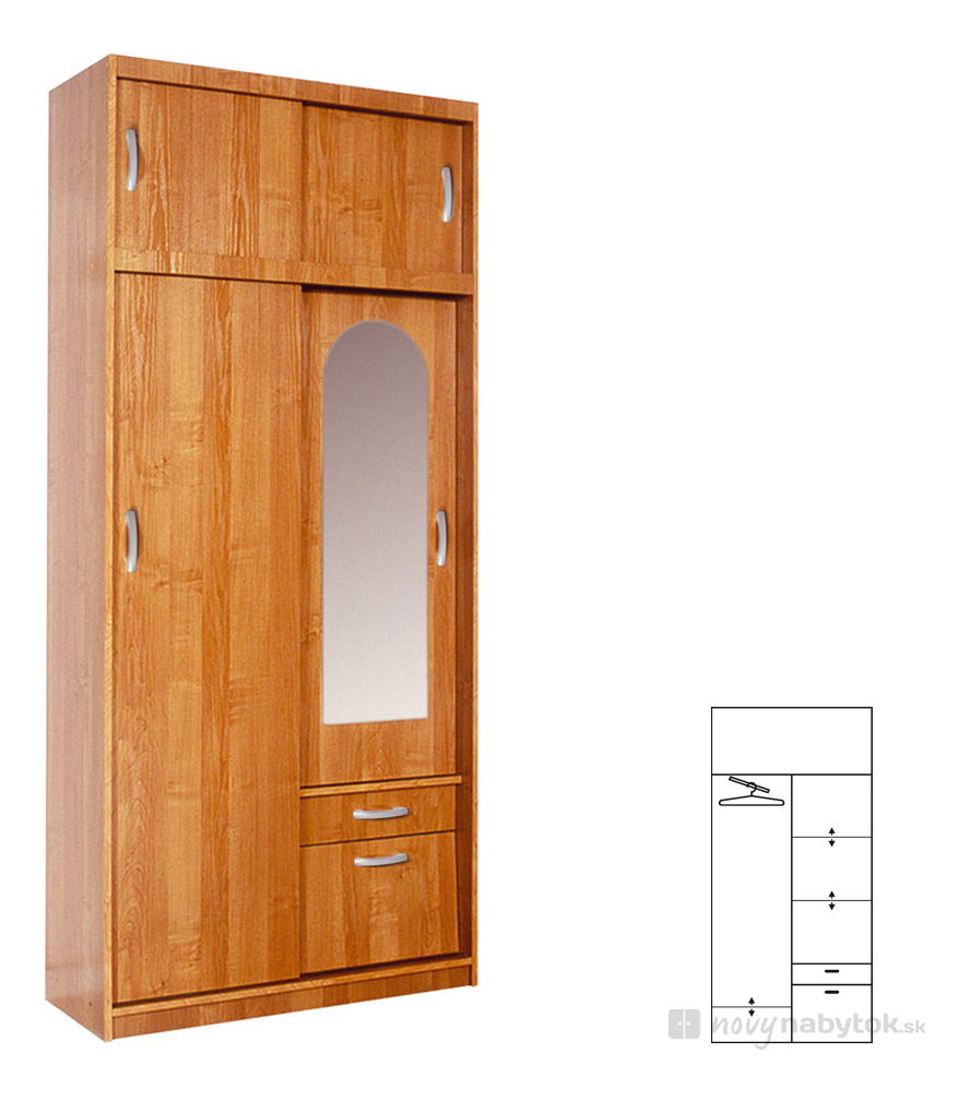 Dvoudílná šatní skříň s posuvnými dveřmi v levé části a s otevíracími dveřmi v pravé části. Pravý díl skříně se zrcadlem je vybaven policemi a na spodku najdete 2 zásuvky. Levý díl je vybaven věšákovou tyčí a na spodku se nachází jedna polička. V horní části se nachází skříňka s posuvnými dveřmi. Šedé oválné úchyty. Provedení olše a buk.