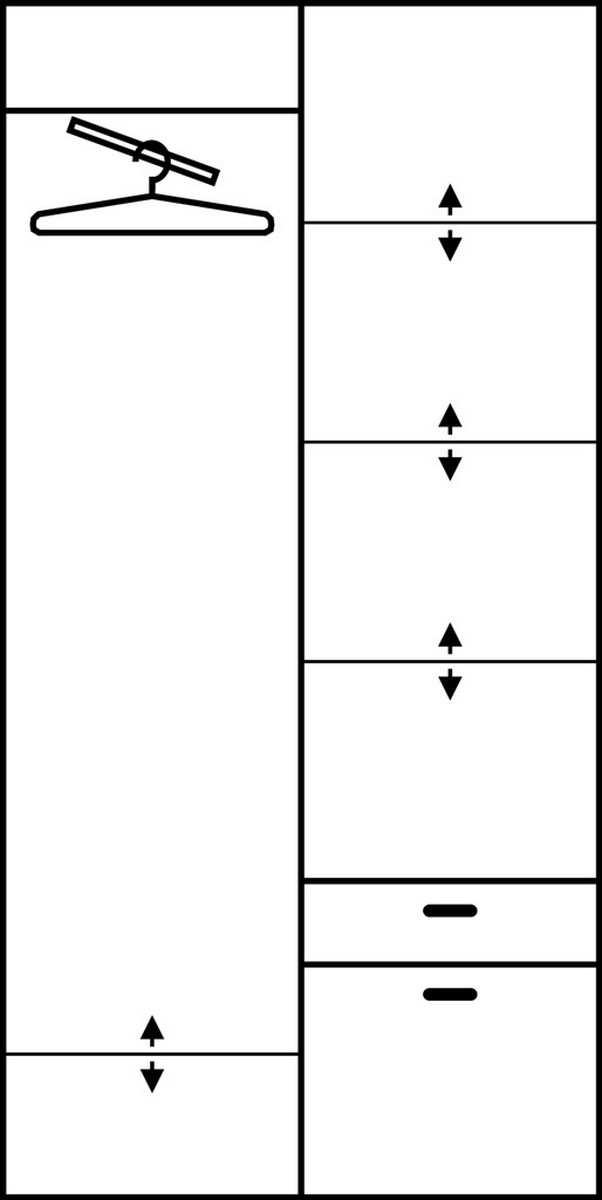 Dvoudílná šatní skříň s posuvnými dveřmi v levé části a otevíracími dveřmi v pravé části. Pravý díl skříně se zrcadlem je vybaven policemi a na spodku najdete 2 zásuvky. Levý díl je vybaven věšákovou tyčí a na spodku se nachází jedna polička. Šedé oválné úchyty. Provedení olše a buk.