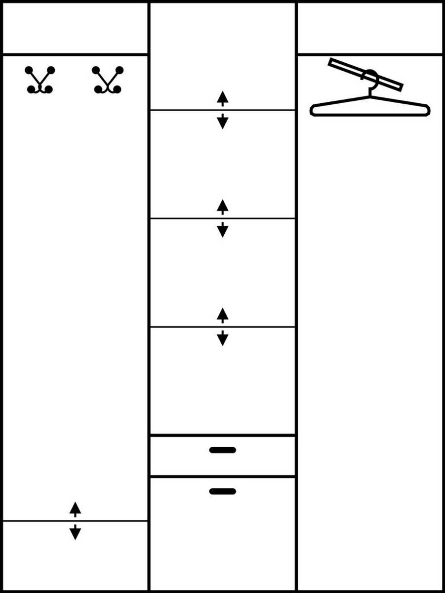 Trojdílná šatní skříň s posuvnými dveřmi a otevíracími dveřmi uprostřed. Pravý díl je vybaven věšákovou tyčí, střední díl je vybaven policemi za posuvnými dveřmi a dvěma zásuvkami na spodku. Levý díl je uvnitř vybaven háčky a na spodku se nachází jedna polička. Šedé oválné úchyty. Provedení olše a buk.