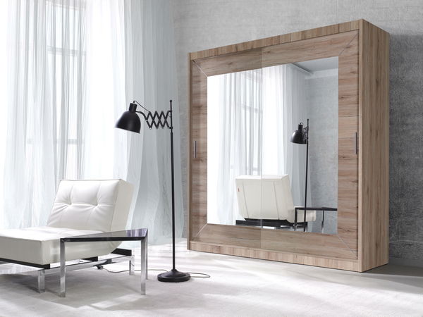 Šatní skříň, která uspokojí i náročnější uživatele. Na posuvných dveřích se nachází zrcadlo, které opticky zvětší prostor. Vnitřní uspořádání je velmi praktické. Nachází se tam věšáková tyč na zavěšení oblečení a výškově nastavitelné police, které si můžete uspořádat podle svých potřeb. Je vyrobená z kvalitní LTD (laminovaná dřevotříska) tloušťky 15 mm. Díky laminátové vrstvě je odolná vůči vodě a mechanickému poškození.