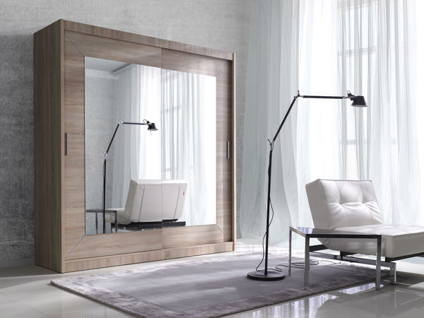 Šatní skříň, která uspokojí i náročnější uživatele. Na posuvných dveřích se nachází zrcadlo, které opticky zvětší prostor. Vnitřní uspořádání je velmi praktické. Nachází se tam věšáková tyč na zavěšení oblečení a výškově nastavitelné police, které si můžete uspořádat podle svých potřeb. Je vyrobená z kvalitní LTD (laminovaná dřevotříska) tloušťky 15 mm. Díky laminátové vrstvě je odolná vůči vodě a mechanickému poškození.