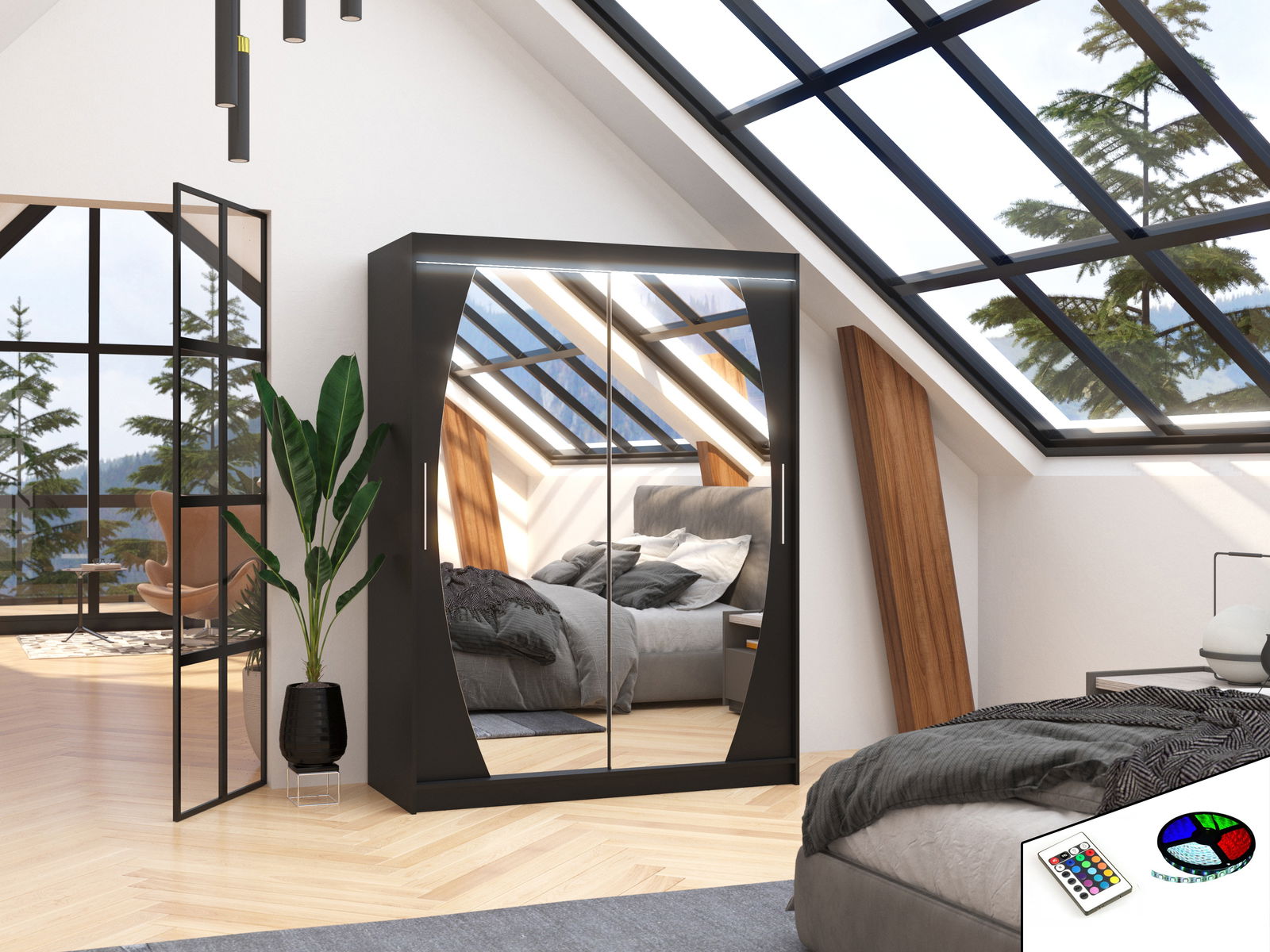 Šatní skříň Arow (černá) (s led osvětlením) (se zrcadlem)