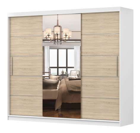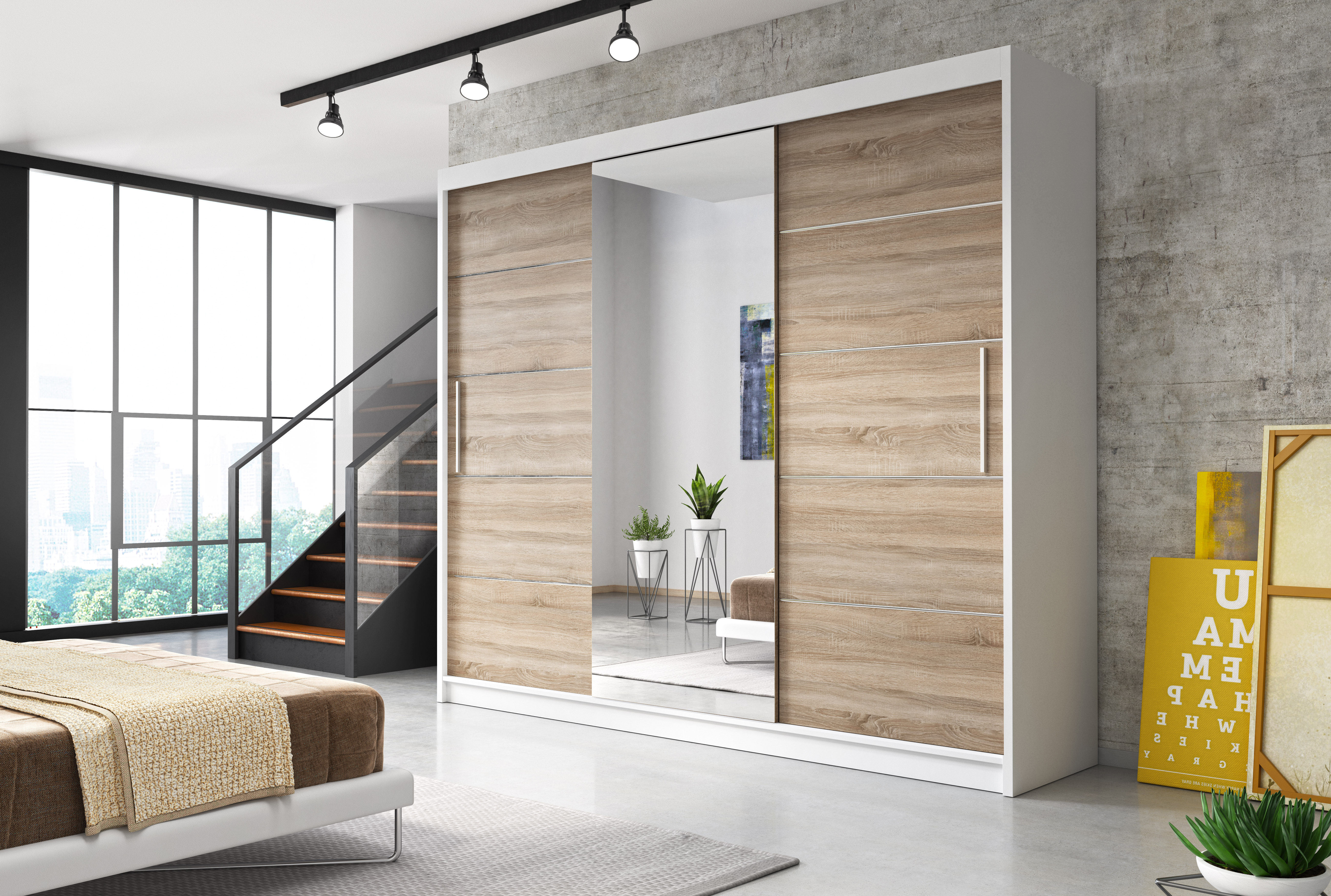Šatní skříň Arrun (bílá + dub sonoma + zrcadlo)