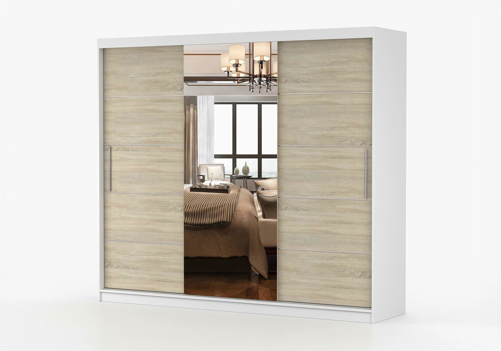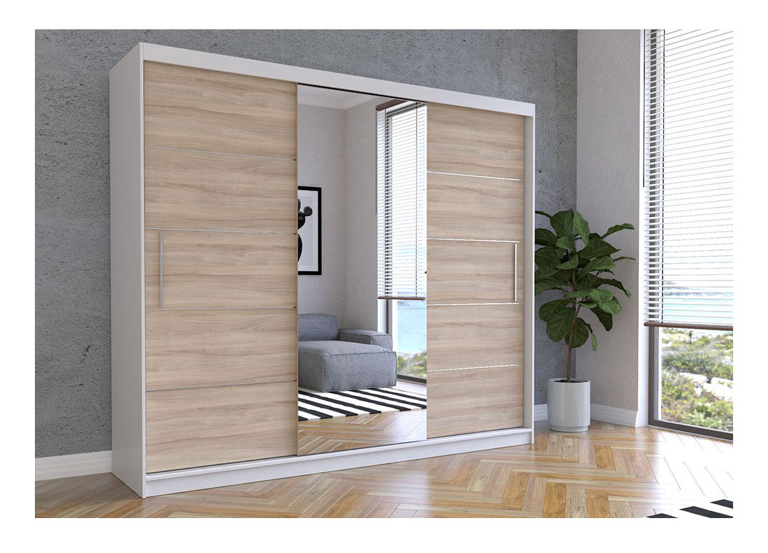 Šatní skříň Arrun (bílá + dub sonoma + zrcadlo) je ideálním doplňkem vašeho interiéru, kde se budou vaše oblečení a doplňky skvěle vyjímat. S výškou 218 cm a hloubkou 61 cm poskytuje dostatek prostoru pro uložení všech vašich věcí. Tento model kombinuje moderní design s kvalitními materiály, vnější materiál tvoří dřevotříska (16 mm), kde vnitřní materiál je také z dřevotřísky (16 mm) s ABS hranami o tloušťce 0,5 mm. Úchyty jsou vyrobeny z PCV. Tato šatní skříň je k dispozici v bílém provedení s dubem sonoma a zrcadlem, což dodává prostoru našlapu osobitý šmrnc. Vynikající vlastností tohoto produktu je také možnost výběru barvy a materiálu dle vašich preferencí a potřeb.
