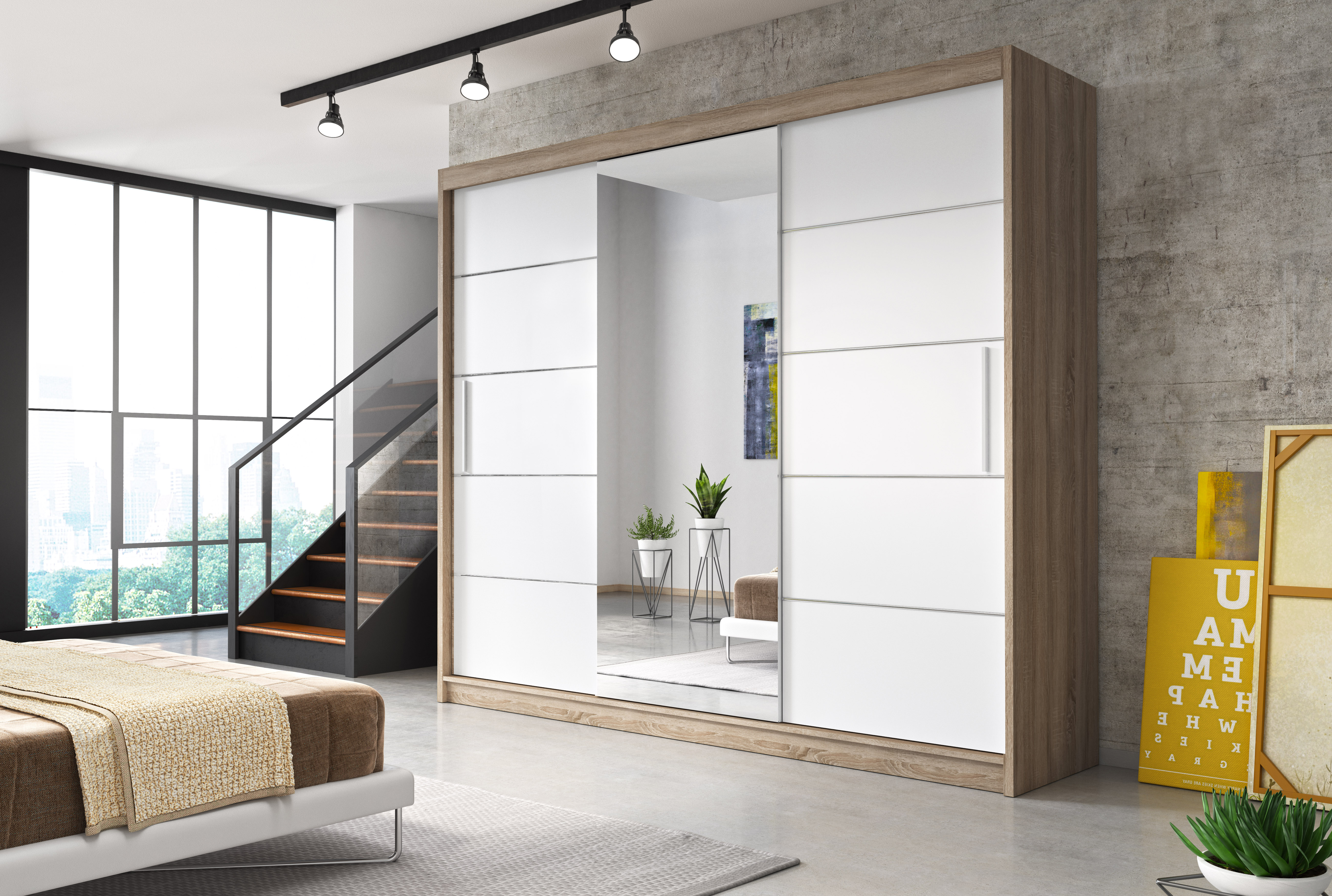 Šatní skříň Arrun (dub sonoma + bílá + zrcadlo)