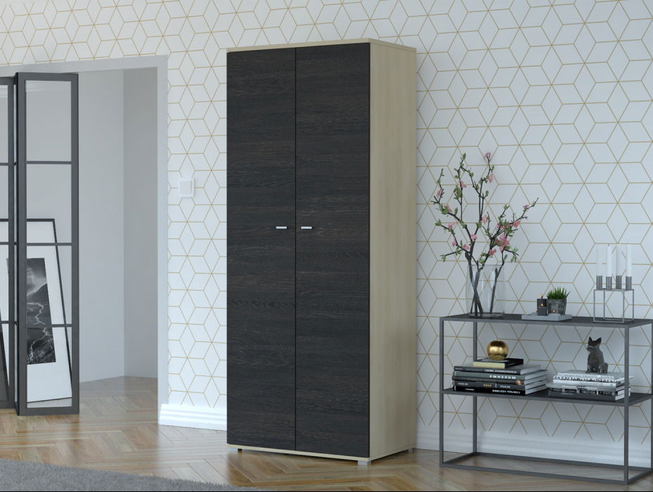 Šatní skříň - Arves (jasan + dub canterbury) o výšce 201 cm, šířce 80 cm a hloubce 51 cm je moderním a praktickým řešením pro uspořádání oblečení. Vnější i vnitřní materiál skříně je vyroben z pevné 16 mm silné dřevotřísky, což garantuje její odolnost. ABS hrany o tloušťce 0,5 mm přidávají na odolnosti a estetickém vzhledu. Skříň je vybavena PVC úchyty, plastovými nožičkami, dvěma dveřmi, jednou tyčí na zavěšení oděvů a jednou poličkou. Zrcadlo není součástí skříně, což umožňuje větší flexibilitu při umístění v pokoji. S touto šatní skříní získáte efektivní úložné prostory s moderním designem.