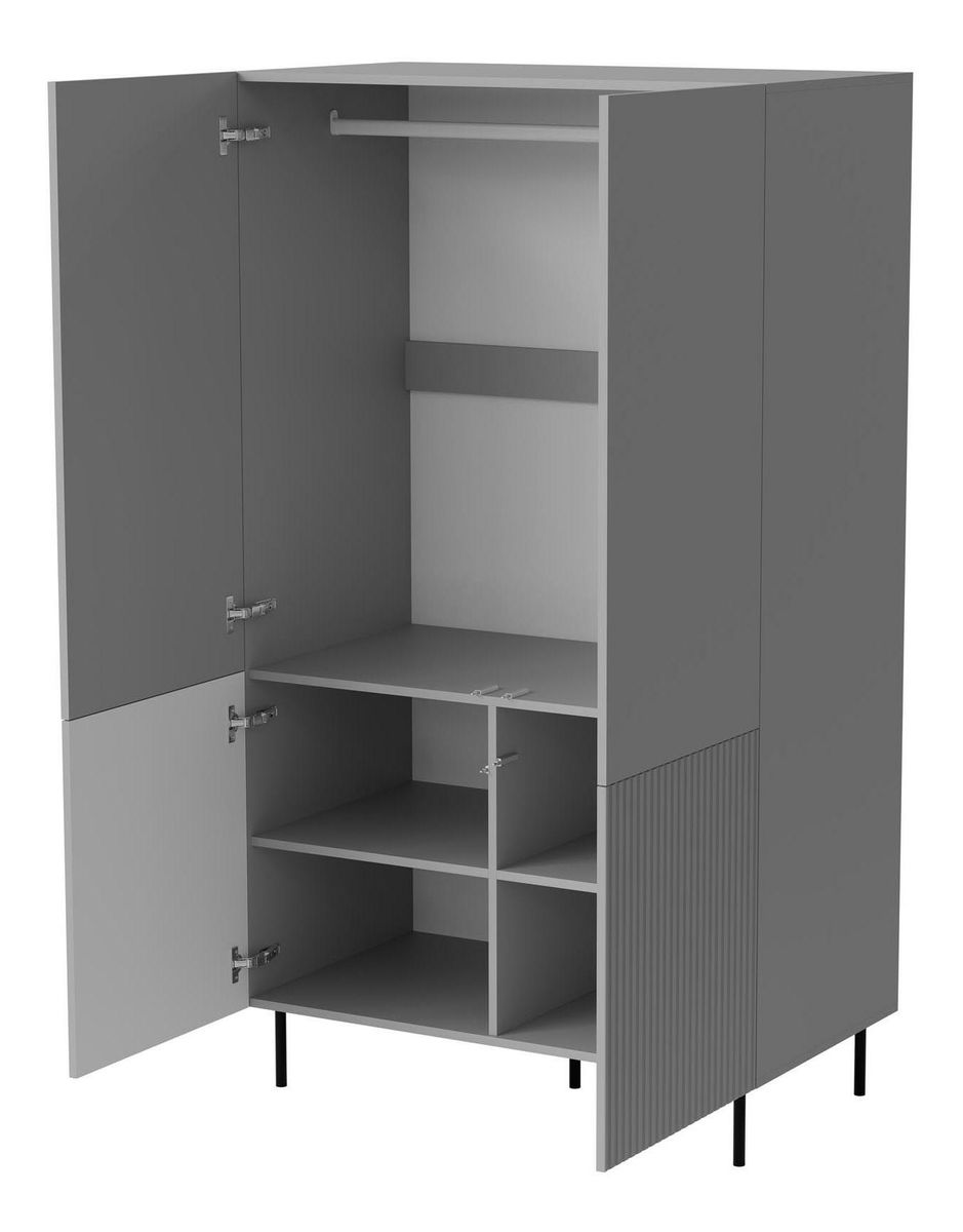 ZobrazitŠatní skříň v moderním stylu je vyrobena z laminované nábytkové desky a podpírána černými ocelovými nohami s práškovým lakováním. Má frézované fronty, čtyři dveře a je vybavena dvěma poličkami a chromovou věšákovou tyčí. Bezúchytkový systém dveří přidává na elegantním a minimalistickém vzhledu, což činí tuto skříň ideálním a praktickým kusem nábytku do každé domácnosti.