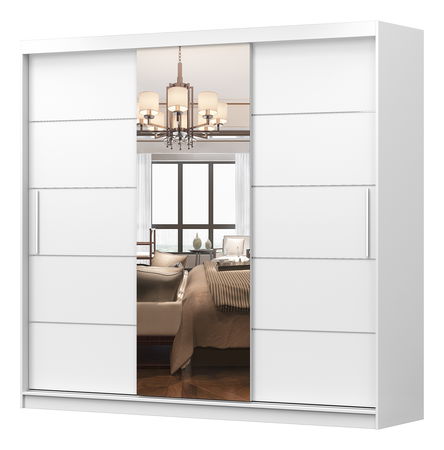 Šatní skříň s integrovaným zrcadlem je ideálním řešením pro uspořádání a skladování oděvů, nabízející přitom funkčnost a estetický design. Vnější i vnitřní materiál skříně je vyroben z 16 mm silné dřevotřísky, zajišťující pevnost a dlouhodobou odolnost. Okraje jsou ošetřeny 0,5 mm silnými ABS hranami pro lepší trvanlivost a estetický vzhled. Skříň je vybavena PVC úchyty ve svislém tvaru, které jsou stříbrné barvy a připevněny šroubovým způsobem, což přidává k eleganci skříně. Přítomnost zrcadla na jedné z jejích tří dveří je praktickým a poutavým prvkem, který zvyšuje funkčnost skříně. Uvnitř skříně se nacházejí dvě podélné tyče pro zavěšení oděvů, umístěné na obou stranách. Kromě toho skříň nabízí bohatý úložný prostor s celkem deseti poličkami – čtyři na levé straně, čtyři na pravé straně a dvě uprostřed, umožňující systematické uspořádání a snadný přístup k oblečení a jiným předmětům. Tento design šatní skříně je ideálním řešením pro organizované a stylové uskladnění v moderní domácnosti.