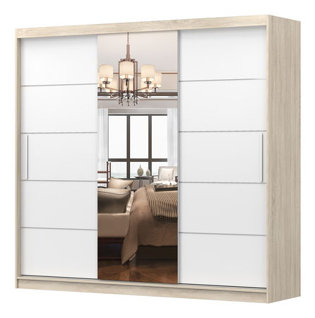 Šatní skříň s integrovaným zrcadlem je ideálním řešením pro uspořádání a skladování oděvů, nabízející přitom funkčnost a estetický design. Vnější i vnitřní materiál skříně je vyroben z 16 mm silné dřevotřísky, zajišťující pevnost a dlouhodobou odolnost. Okraje jsou ošetřeny 0,5 mm silnými ABS hranami pro lepší trvanlivost a estetický vzhled. Skříň je vybavena PVC úchyty ve svislém tvaru, které jsou stříbrné barvy a připevněny šroubovým způsobem, což přidává k eleganci skříně. Přítomnost zrcadla na jedné z jejích tří dveří je praktickým a poutavým prvkem, který zvyšuje funkčnost skříně. Uvnitř skříně se nacházejí dvě podélné tyče pro zavěšení oděvů, umístěné na obou stranách. Kromě toho skříň nabízí bohatý úložný prostor s celkem deseti poličkami – čtyři na levé straně, čtyři na pravé straně a dvě uprostřed, umožňující systematické uspořádání a snadný přístup k oblečení a jiným předmětům. Tento design šatní skříně je ideálním řešením pro organizované a stylové uskladnění v moderní domácnosti.
