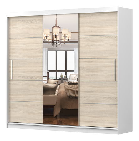 Šatní skříň s integrovaným zrcadlem je ideálním řešením pro uspořádání a skladování oděvů, nabízející přitom funkčnost a estetický design. Vnější i vnitřní materiál skříně je vyroben z 16 mm silné dřevotřísky, zajišťující pevnost a dlouhodobou odolnost. Okraje jsou ošetřeny 0,5 mm silnými ABS hranami pro lepší trvanlivost a estetický vzhled. Skříň je vybavena PVC úchyty ve svislém tvaru, které jsou stříbrné barvy a připevněny šroubovým způsobem, což přidává k eleganci skříně. Přítomnost zrcadla na jedné z jejích tří dveří je praktickým a poutavým prvkem, který zvyšuje funkčnost skříně. Uvnitř skříně se nacházejí dvě podélné tyče pro zavěšení oděvů, umístěné na obou stranách. Kromě toho skříň nabízí bohatý úložný prostor s celkem deseti poličkami – čtyři na levé straně, čtyři na pravé straně a dvě uprostřed, umožňující systematické uspořádání a snadný přístup k oblečení a jiným předmětům. Tento design šatní skříně je ideálním řešením pro organizované a stylové uskladnění v moderní domácnosti.