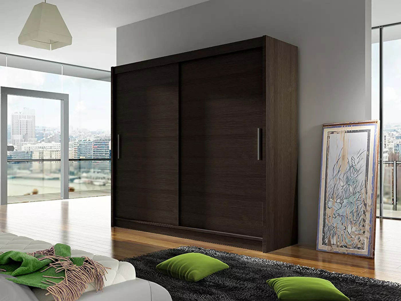 ZobrazitŠatní skříň Bega ocení ti, kteří si nepotrpí na design, ale hledají především praktičnost nábytku. Bega má praktické posuvné dveře a ukrývá v sobě dostatečné množství úložného prostoru, ať už pro vaše oblečení, povlečení nebo doplňky. V levé části se nachází věšáková tyč a v pravé části se nacházejí police. V horní části se nachází další úložný prostor. Skříň je v barevném provedení choco.