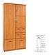 Dvoudílná šatní skříň s dveřmi na pantech. Pravý díl skříně je vybaven skříňkami se samostatnými dvířky a 4 úzkými zásuvkami. Levý díl je vybaven věšákovou tyčí pod horní poličkou. Na spodku se nachází jedna samostatná skříňka na boty nebo botník. Šedé oválné úchyty. Provedení olše a buk.