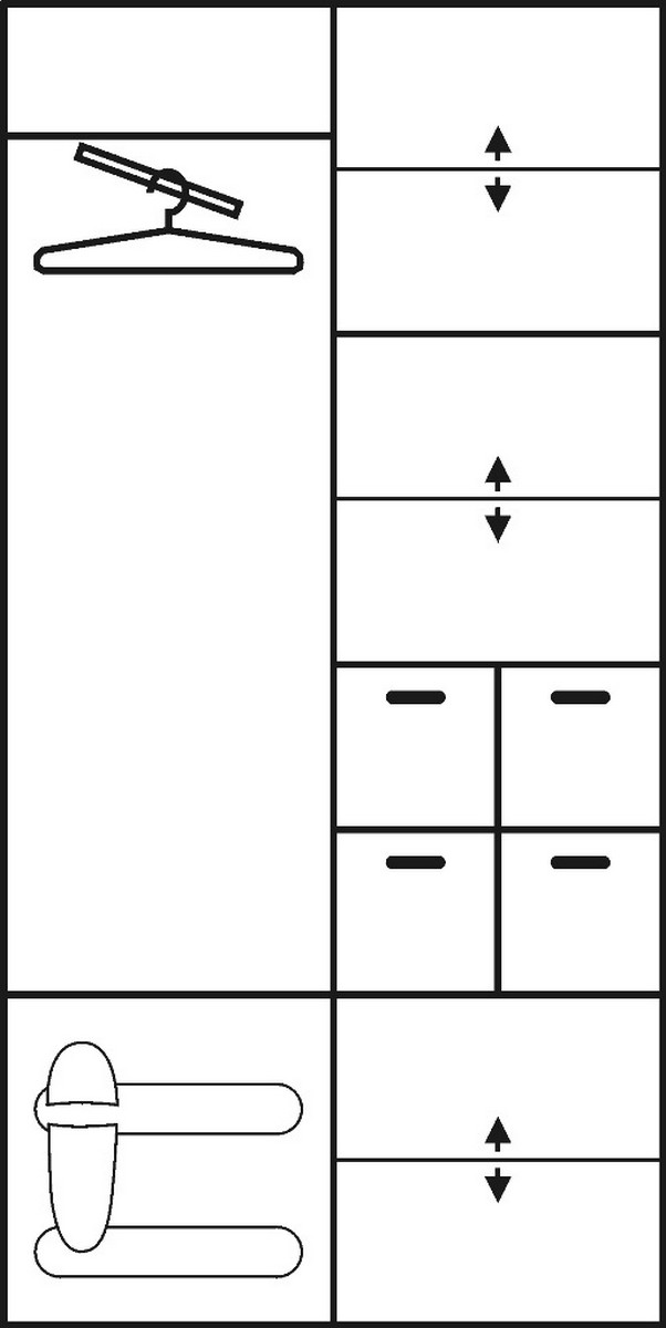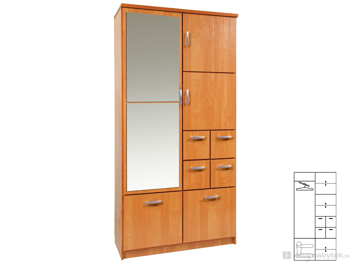 Dvoudílná šatní skříň s dveřmi na pantech. Pravý díl skříně je vybaven skříňkami se samostatnými dvířky a 4 úzkými zásuvkami. Levý díl je vybaven věšákovou tyčí pod horní poličkou a na dveřích má umisťuje zrcadlo skládající se ze 2 dílů. Na spodku se nachází jedna samostatná skříňka na boty nebo botník. Šedé oválné úchyty. Provedení olše a buk.