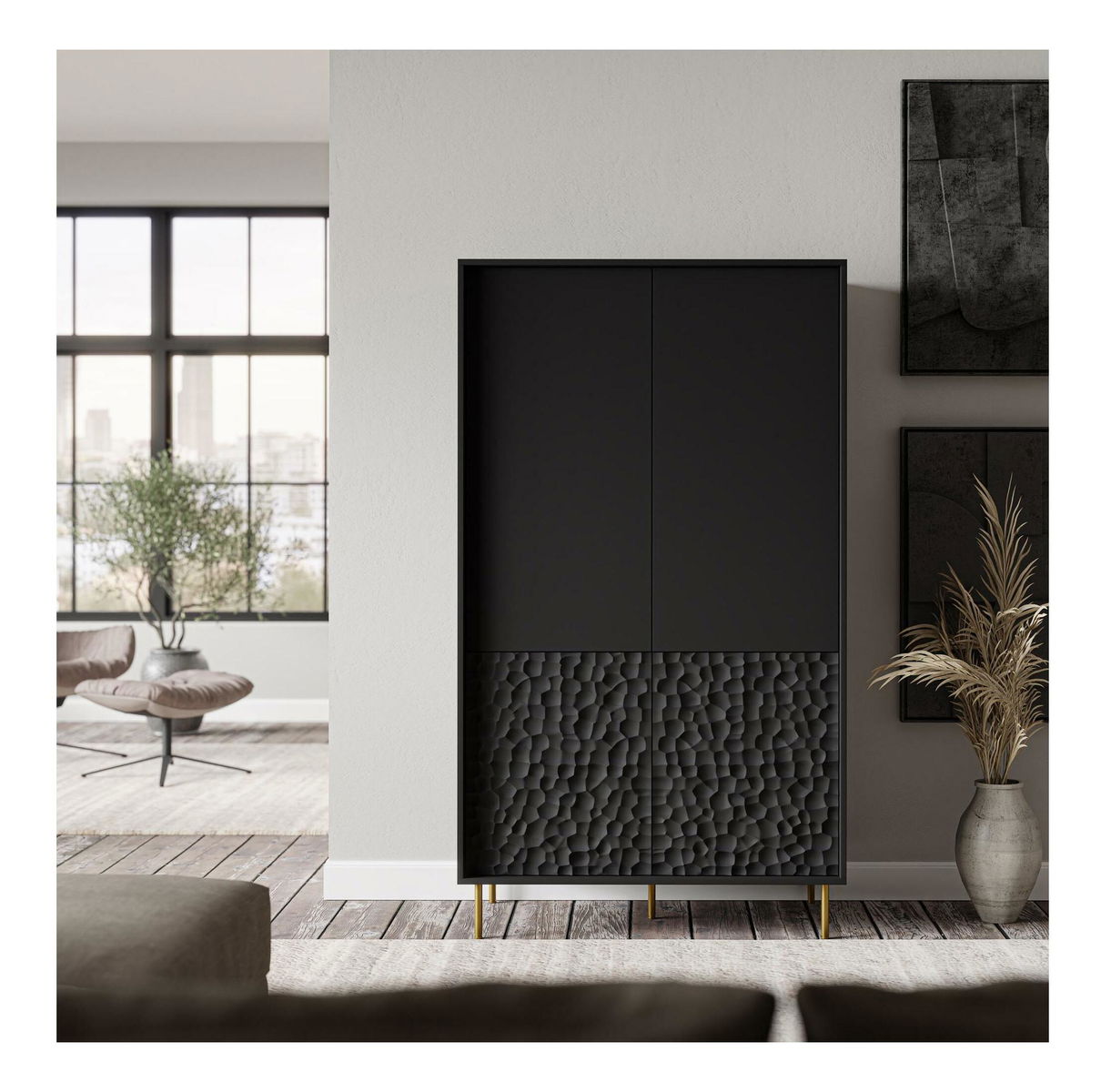 ZobrazitŠatní skříň v moderním stylu nabízí kombinaci estetiky a funkčnosti. Je vyrobena z laminované nábytkové desky, která zaručuje dlouhodobou odolnost. Nohy skříně jsou z ocelového materiálu, práškově lakovány ve zlaté barvě, což dodává nábytku luxusní vzhled. Fronty skříně jsou zdobeny frézovaným „bublinovým“ vzorem, který přidává na jedinečnosti designu. Skříň obsahuje čtyři dveře, dvě poličky pro účinnou organizaci a chromovou věšákovou tyč pro zavěšení oblečení. Systém bezúchytkových dveří zajišťuje hladký a minimalistický vzhled, což skříň předurčuje být středem pozornosti v každé místnosti.