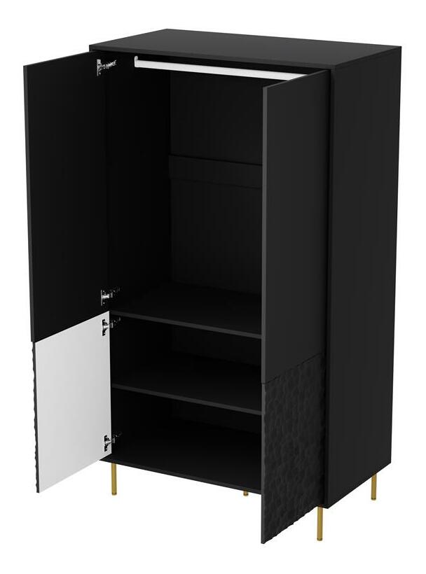 Šatní skříň v moderním stylu nabízí kombinaci estetiky a funkčnosti. Je vyrobena z laminované nábytkové desky, která zaručuje dlouhodobou odolnost. Nohy skříně jsou z ocelového materiálu, práškově lakovány ve zlaté barvě, což dodává nábytku luxusní vzhled. Fronty skříně jsou zdobeny frézovaným „bublinovým“ vzorem, který přidává na jedinečnosti designu. Skříň obsahuje čtyři dveře, dvě poličky pro účinnou organizaci a chromovou věšákovou tyč pro zavěšení oblečení. Systém bezúchytkových dveří zajišťuje hladký a minimalistický vzhled, což skříň předurčuje být středem pozornosti v každé místnosti.