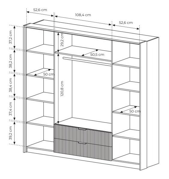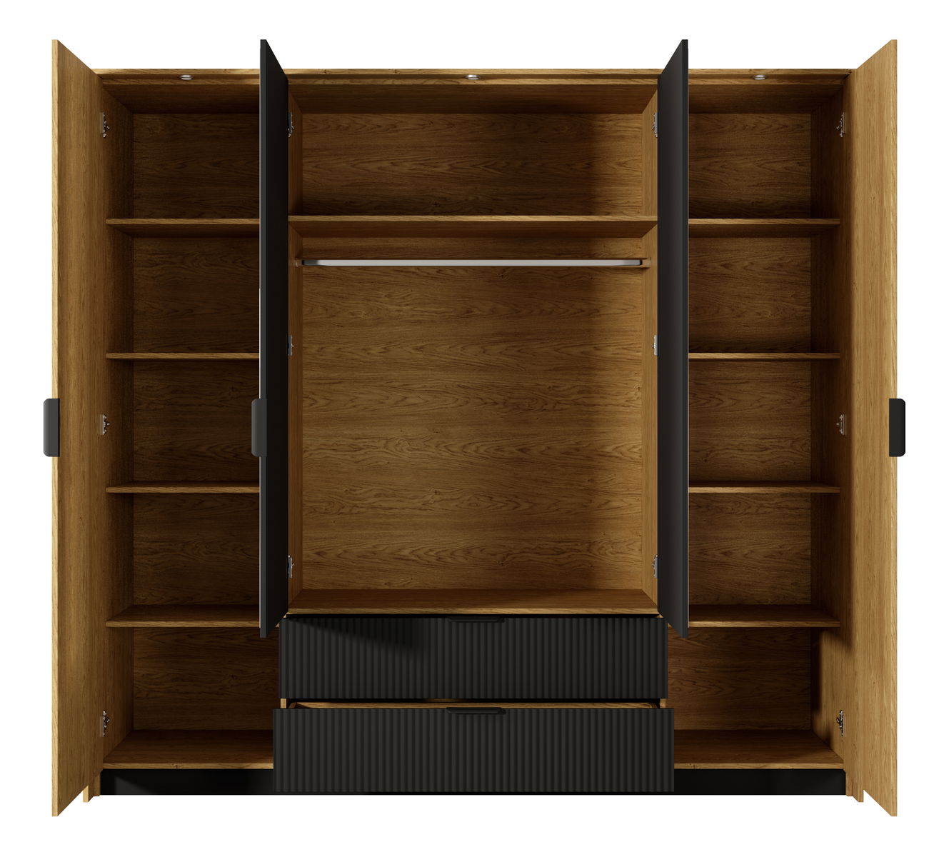 ZobrazitTato moderní šatní skříň nabízí dokonalou kombinaci funkčnosti a elegantního designu. Korpus i přední plochy jsou vyrobeny z laminované dřevotřísky E05, přičemž čelní část je doplněna o kvalitní MDF desku pro vyšší pevnost a atraktivní vzhled. Zadní deska v dekoru dub craft zlatý přináší teplý přírodní akcent. Skříň disponuje čtyřmi dvířky, z nichž část je doplněna zrcadlem, což opticky zvětší prostor a zároveň zvýší praktičnost při každodenním používání. Vnitřní uspořádání nabízí dostatek prostoru díky devíti policím a jedné ramínkové tyči. Dvě prostorné zásuvky na kuličkových ložiskách s plným výsuvem umožňují pohodlné uskladnění prádla či doplňků. Černé kovové úchyty dodávají nábytku moderní charakter, zatímco panty s tichým zavíráním zajišťují komfort při manipulaci s dvířky. Pro ještě atraktivnější vzhled lze skříň doplnit o LED osvětlení za příplatek. Tato šatní skříň je ideální volbou pro každého, kdo hledá spojení stylu, kvality a praktického řešení úložného prostoru.