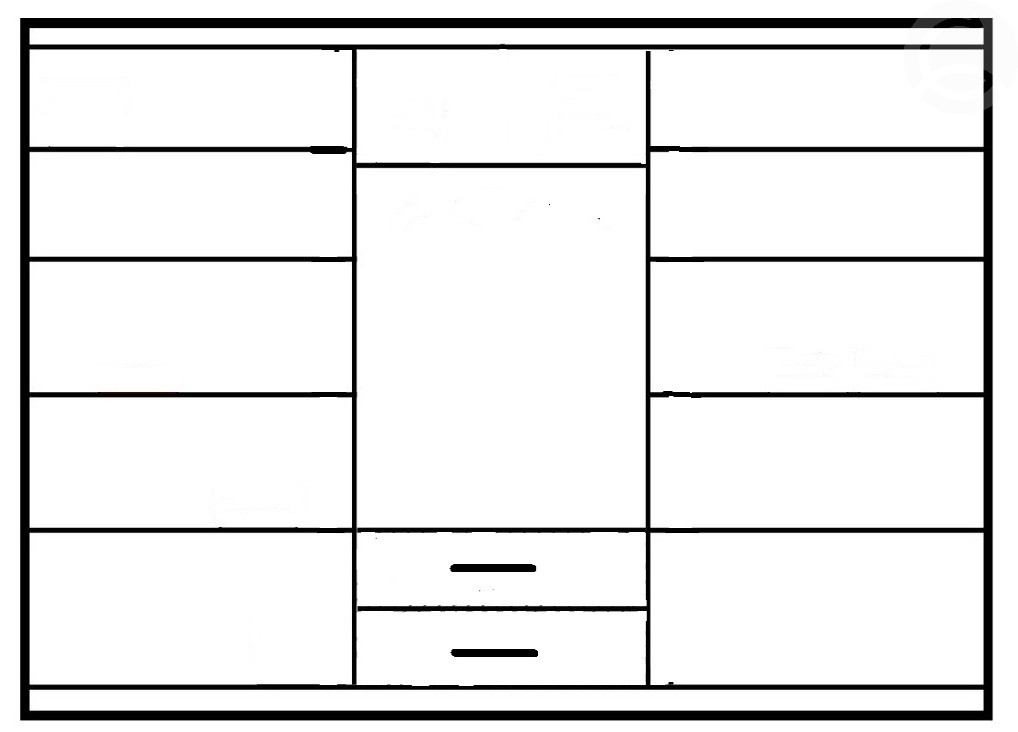Šatní skříň se 2 posuvnými dveřmi v moderním provedení. Korpus a dveře z kvalitního LTD jsou v bílé matné barvě. Jedny dveře jsou osazeny zrcadlem. Uprostřed dveří je dekor ze tří vodorovných čar. Uspořádání polic viz. menší obrázek. Hrany u skříně jsou ohraničeny ABS páskou a skříň má hliníkové pojezdy. Dodáváme v demontovaném stavu.