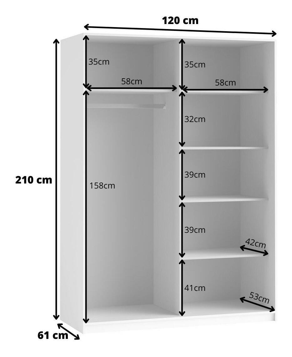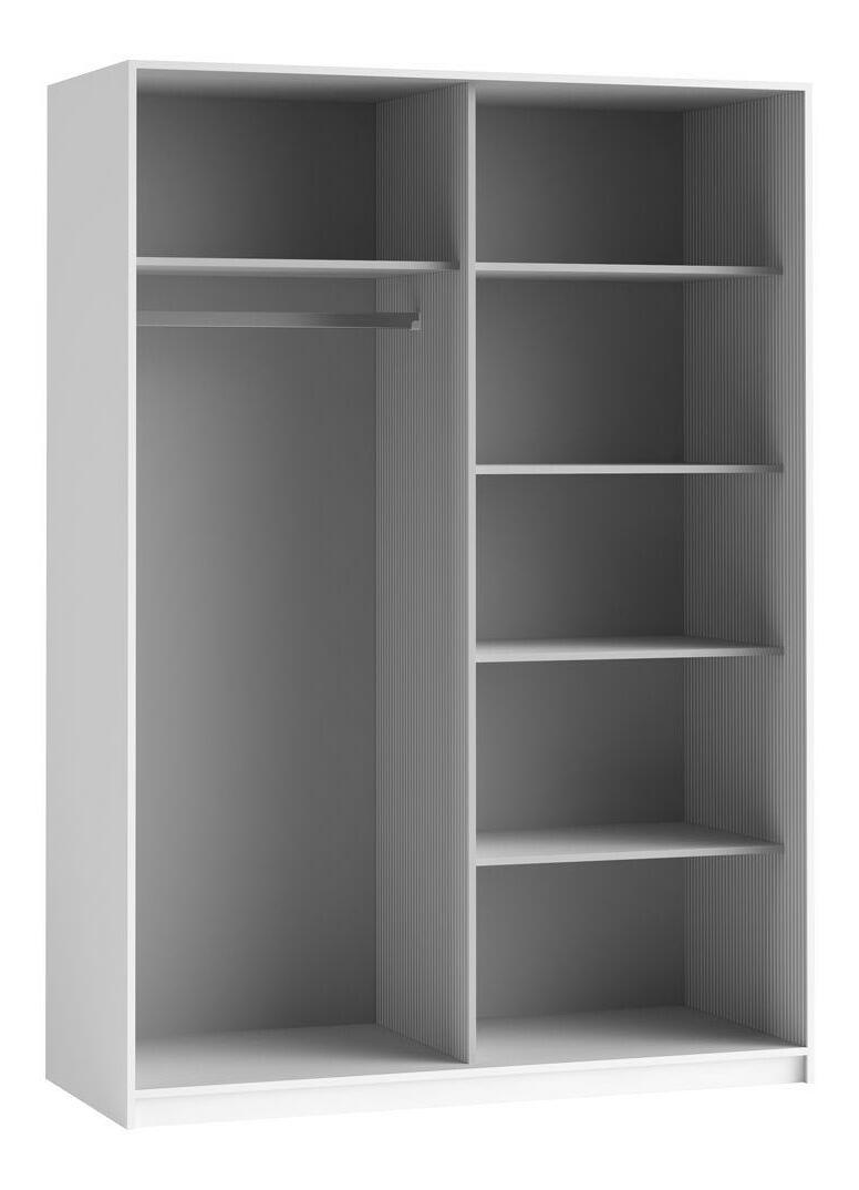 Prostorná šatní skříň se spoustou úložného prostoru. Mít pořádek v oblečení nebylo nikdy jednodušší. V pravé části se nacházejí čtyři poličky. Do části levé si můžete na věšákovou tyč zavěsit své oblečení. Posuvné dveře šetří prostor, protože se neotevírají do strany.