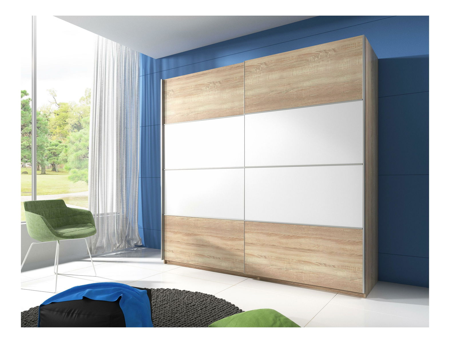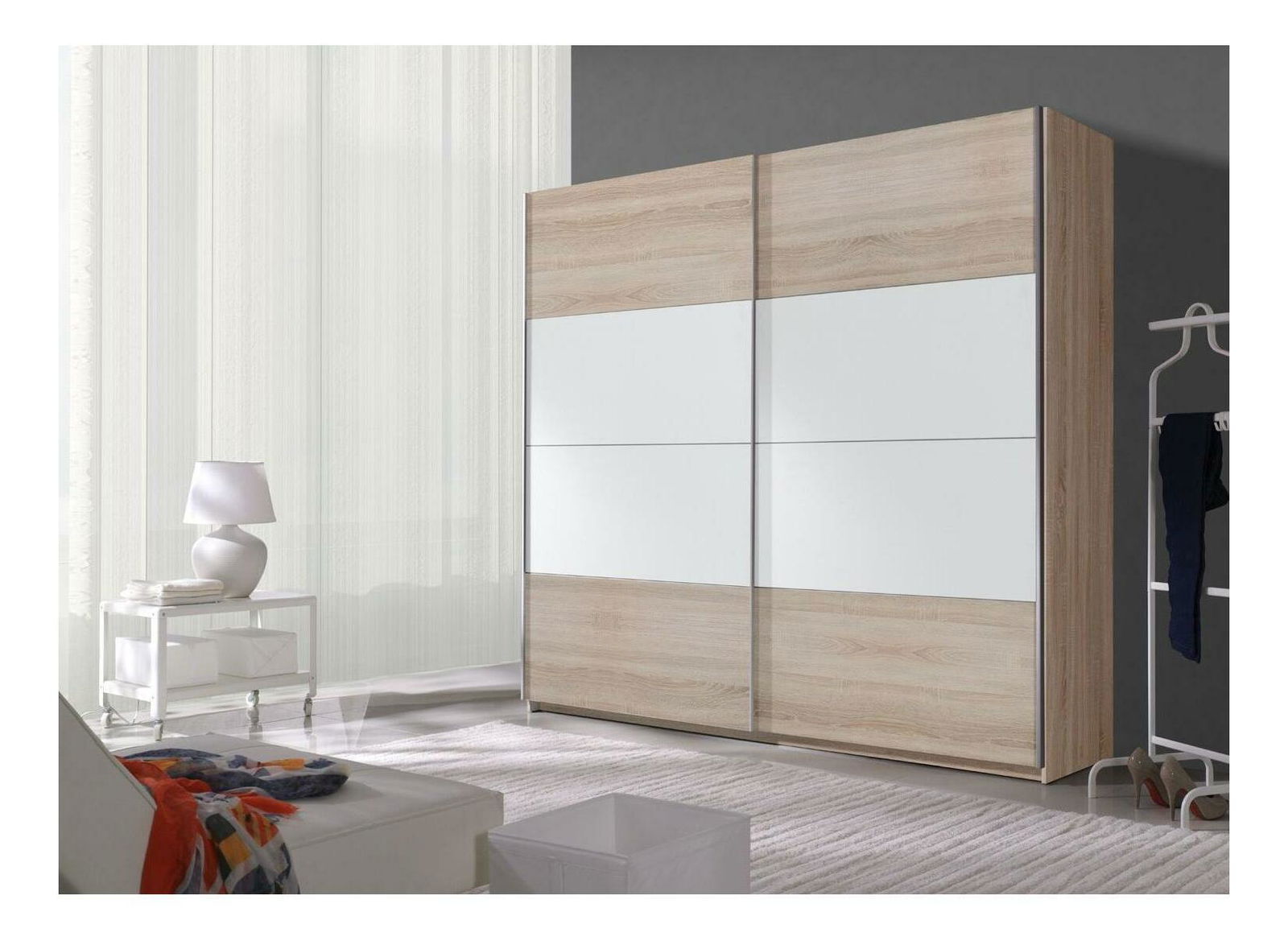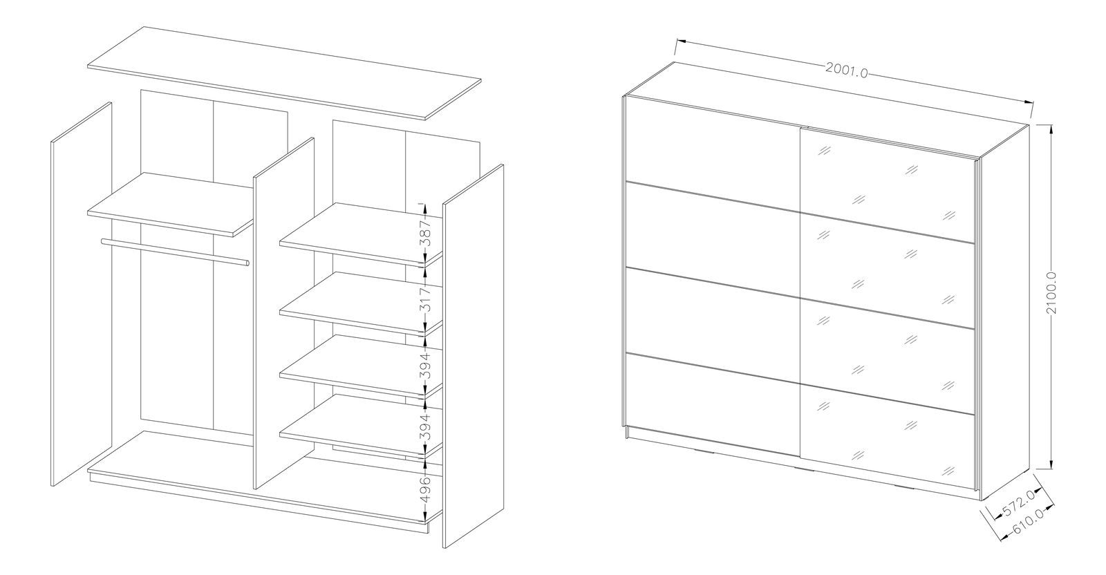 Kombinace policové a šatní skříně je praktickým doplňkem do ložnice nebo předsíně. V levé části můžete pověsit oblečení na šatní tyč a v pravé si oblečení poskládat do polic. Místo ušetří posuvné dveře, protože nemusíte počítat s prostorem na jejich otevírání. Skříň obsahuje i zrcadlo, které je umístěno na posuvných dveřích.