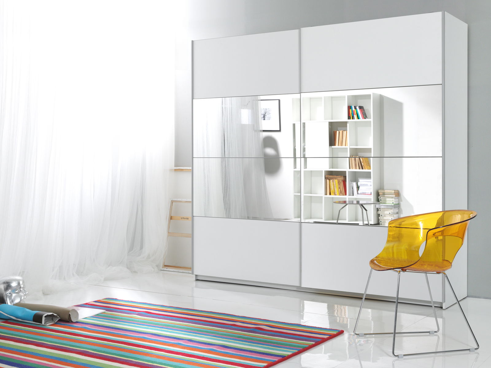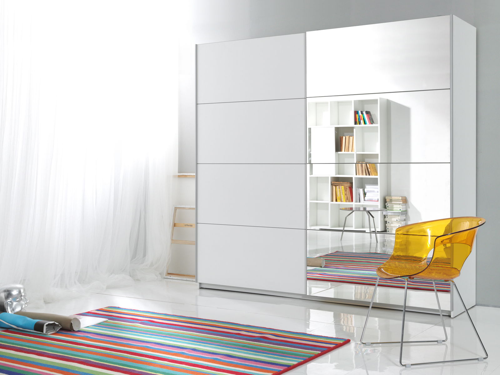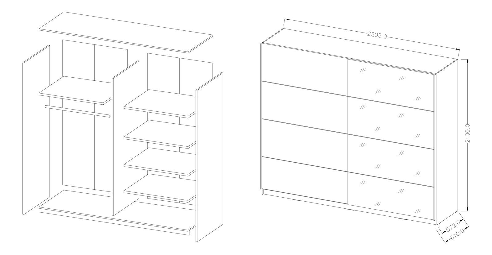 Kombinace policové a šatní skříně je praktickým doplňkem do ložnice nebo předsíně. V levé části můžete pověsit oblečení na šatní tyč a v pravé si oblečení poskládat do polic. Místo ušetří posuvné dveře, protože nemusíte počítat s prostorem na jejich otevírání. Možnost vlastního rozložení zrcátek.