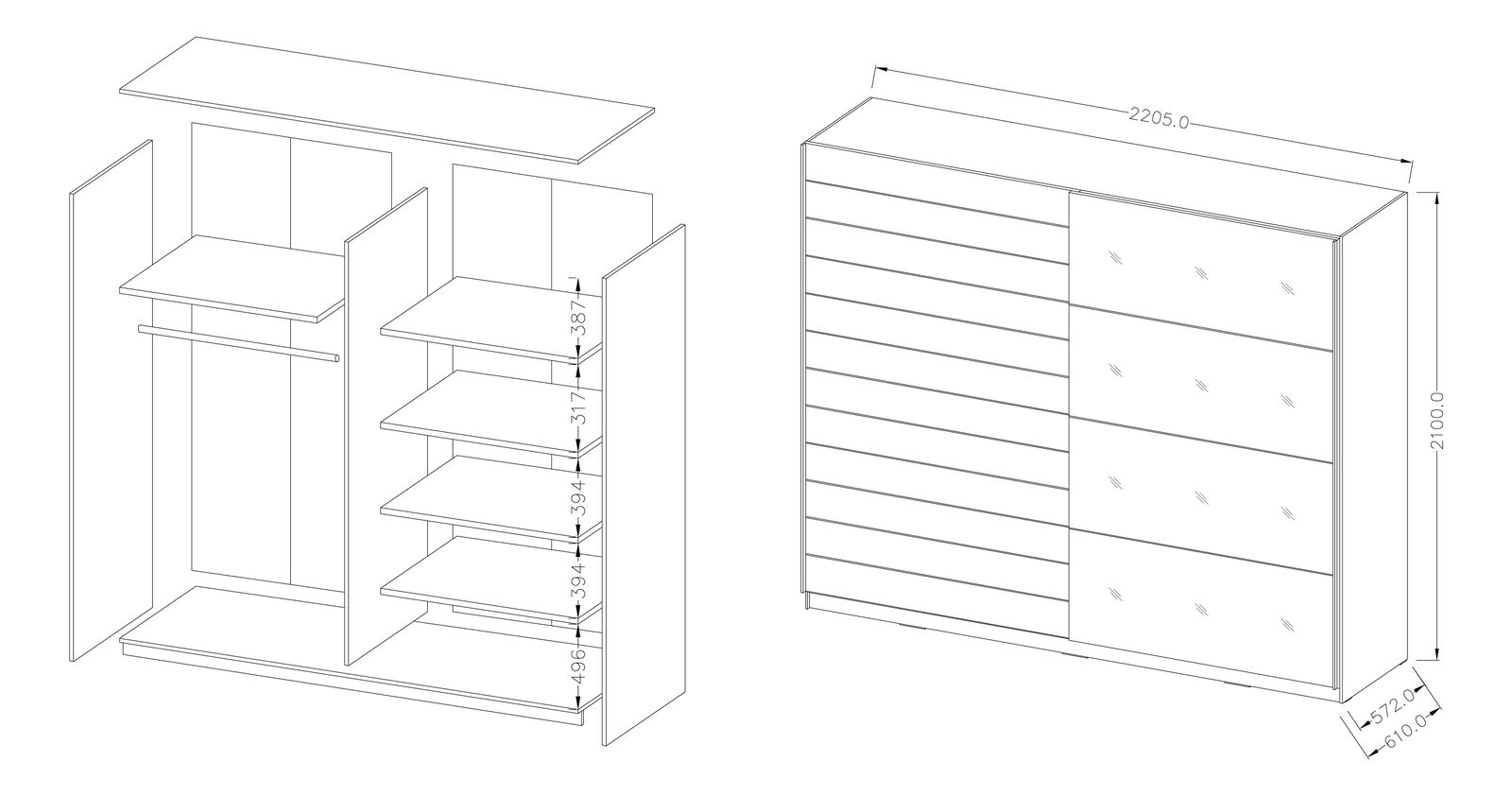 Prostorná šatní skříň s množstvím úložného prostoru. Mít pořádek v oblečení nebylo nikdy jednodušší. V pravé části se nacházejí čtyři poličky. Do části levé si můžete na věšákovou tyč pověsit své oblečení. Posuvné dveře šetří prostor, protože se neotevírají do strany.